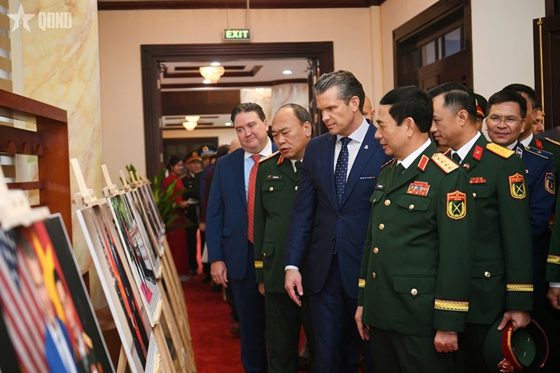 The two defense ministers tour a photo exhibition on Vietnam - U.S. relations and bilateral defense cooperation.