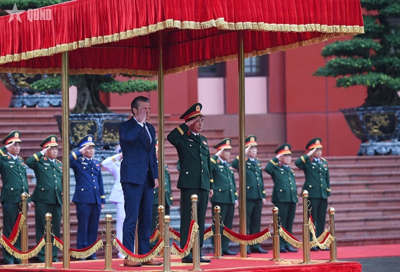 The two ministers review the guards-of- honor of the Vietnam People’s Army.