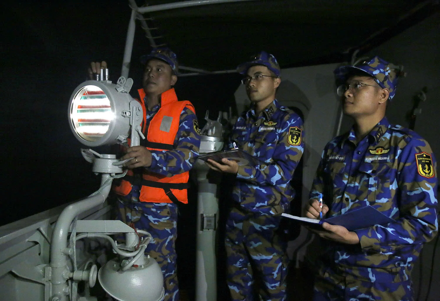 Sĩ quan, thủy thủ biên đội tàu hộ vệ tên lửa của Việt Nam thực hiện khoa mục thông tin ánh đèn. ẢNH: HOÀNG DIỆU