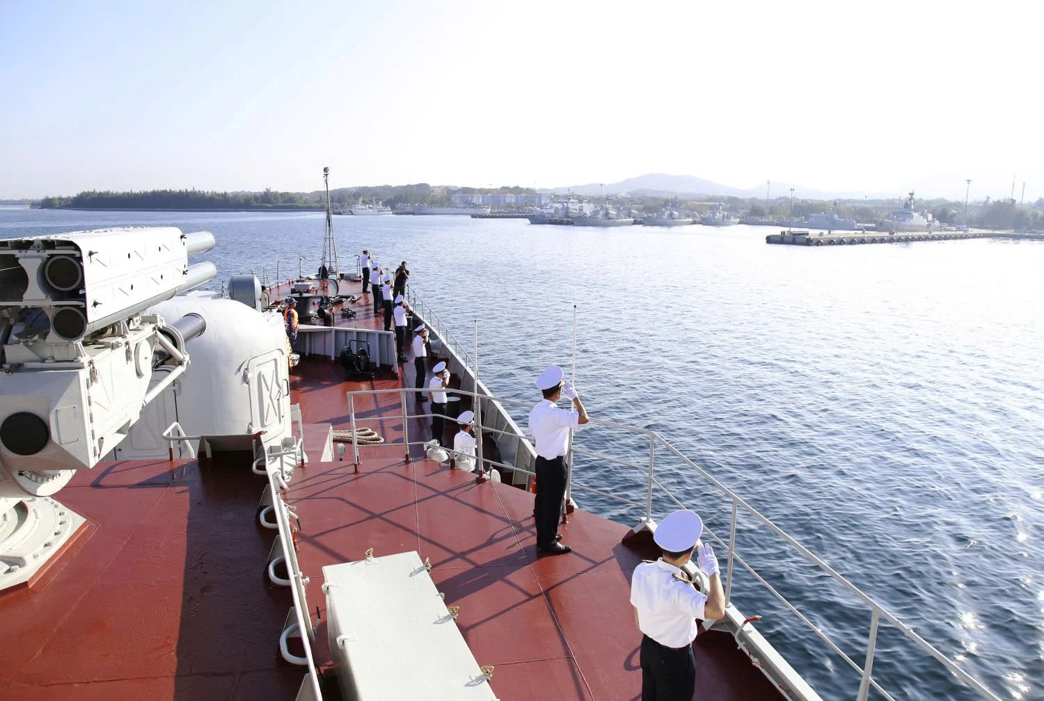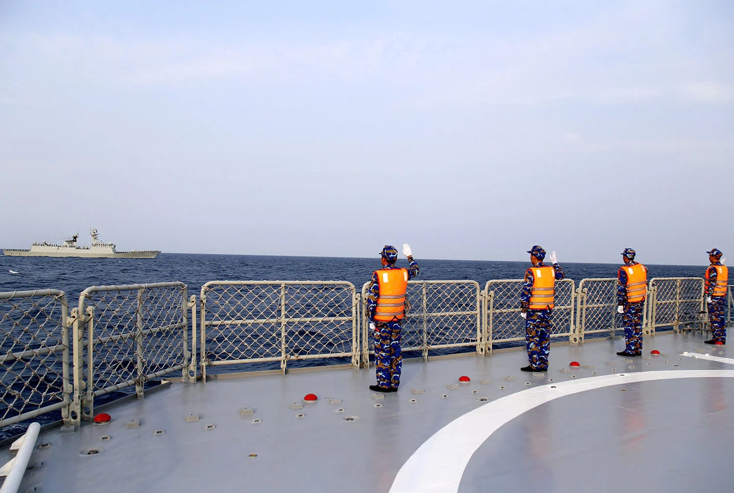 Tàu hải quân hai nước chào nhau trên biển sau khi hoàn thành nhiệm vụ tuần tra, huấn luyện liên hợp trên vùng biển vịnh Bắc bộ. ẢNH: HOÀNG DIỆU