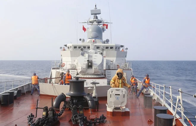 Sau khi tham gia các hoạt động trong khuôn khổ Giao lưu hữu nghị quốc phòng biên giới Việt Nam - Trung Quốc lần thứ 10 tại cảng Phòng Thành (Quảng Tây, Trung Quốc), trưa 19.3, biên đội tàu hộ vệ tên lửa 015 và 012 cùng biên đội tàu 568, tàu 627 của Hải quân Trung Quốc thành lập đội hình, bước vào tuần tra liên hợp và huấn luyện liên hợp trên vùng biển vịnh Bắc bộ. ẢNH: HOÀNG DIỆU