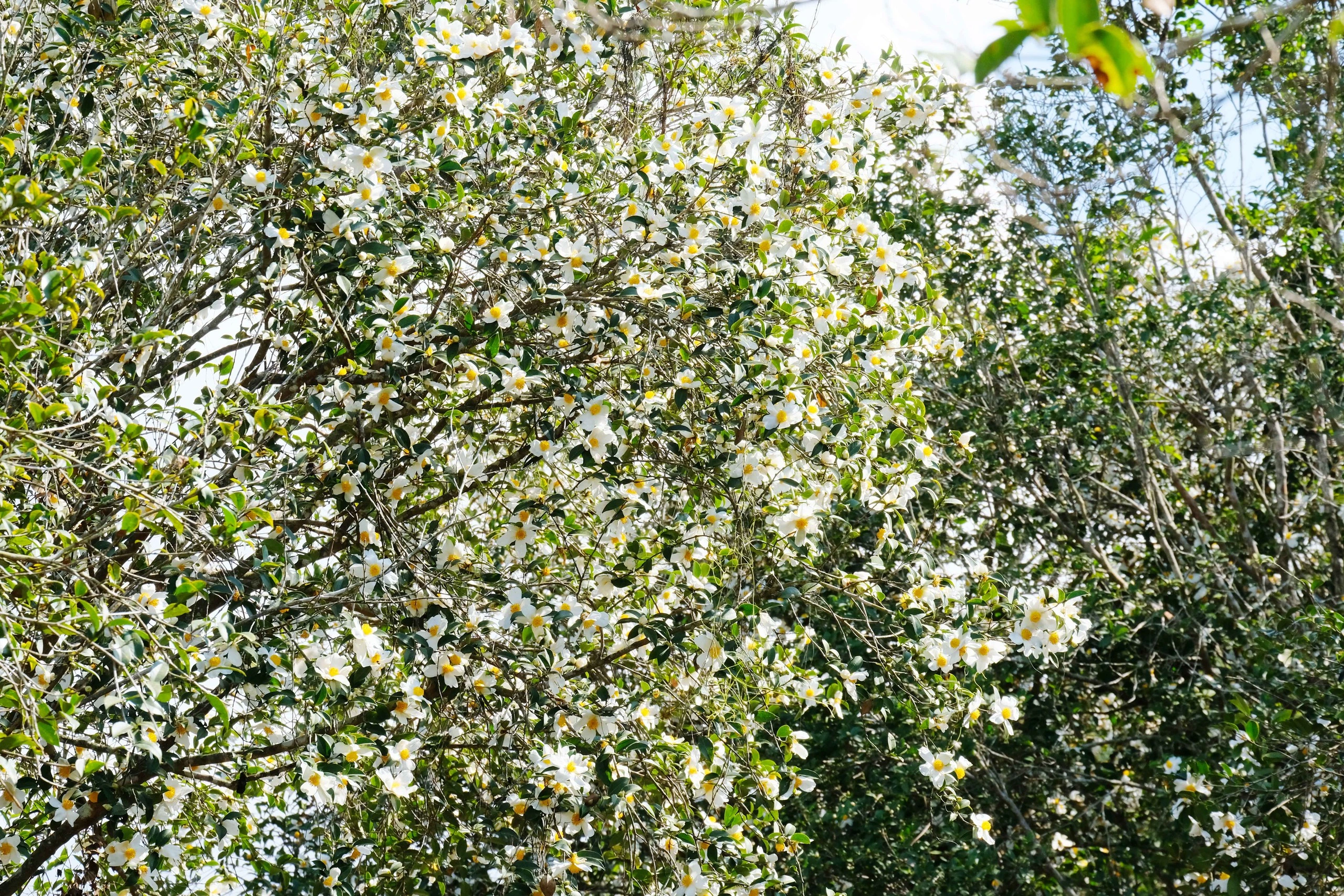 Tại rừng sở Đồng Long, xã Lục Hồn, hàng nghìn gốc sở cổ thụ vẫn được bảo tồn gần như nguyên vẹn. Không rực rỡ sắc màu, hoa sở chinh phục du khách bằng vẻ đẹp mộc mạc. Cánh trắng tinh khôi, nhụy vàng dịu nhẹ, nở thành từng chùm giữa nền xanh thẳm của núi rừng. Trong làn gió lạnh cuối năm, cánh hoa khẽ rơi trên lối mòn, tạo nên không gian lãng mạn, tĩnh tại giữa miền biên viễn.