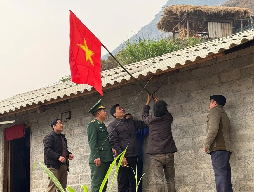 Cán bộ, chiến sĩ Đồn Biên phòng Sơn Vĩ tới nhà dân tuyên truyền và treo cờ Tổ quốc.