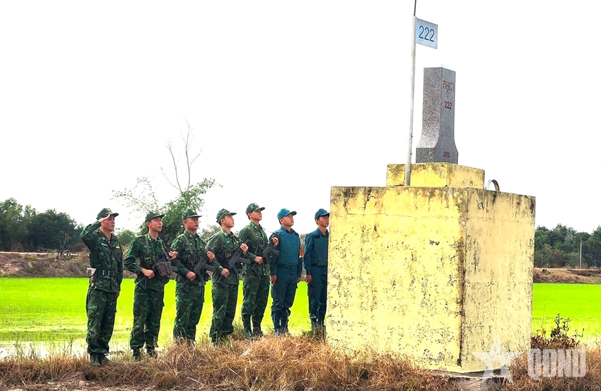 Cán bộ, chiến sĩ Đồn Biên phòng Long Khốt chào cột mốc chủ quyền 222.