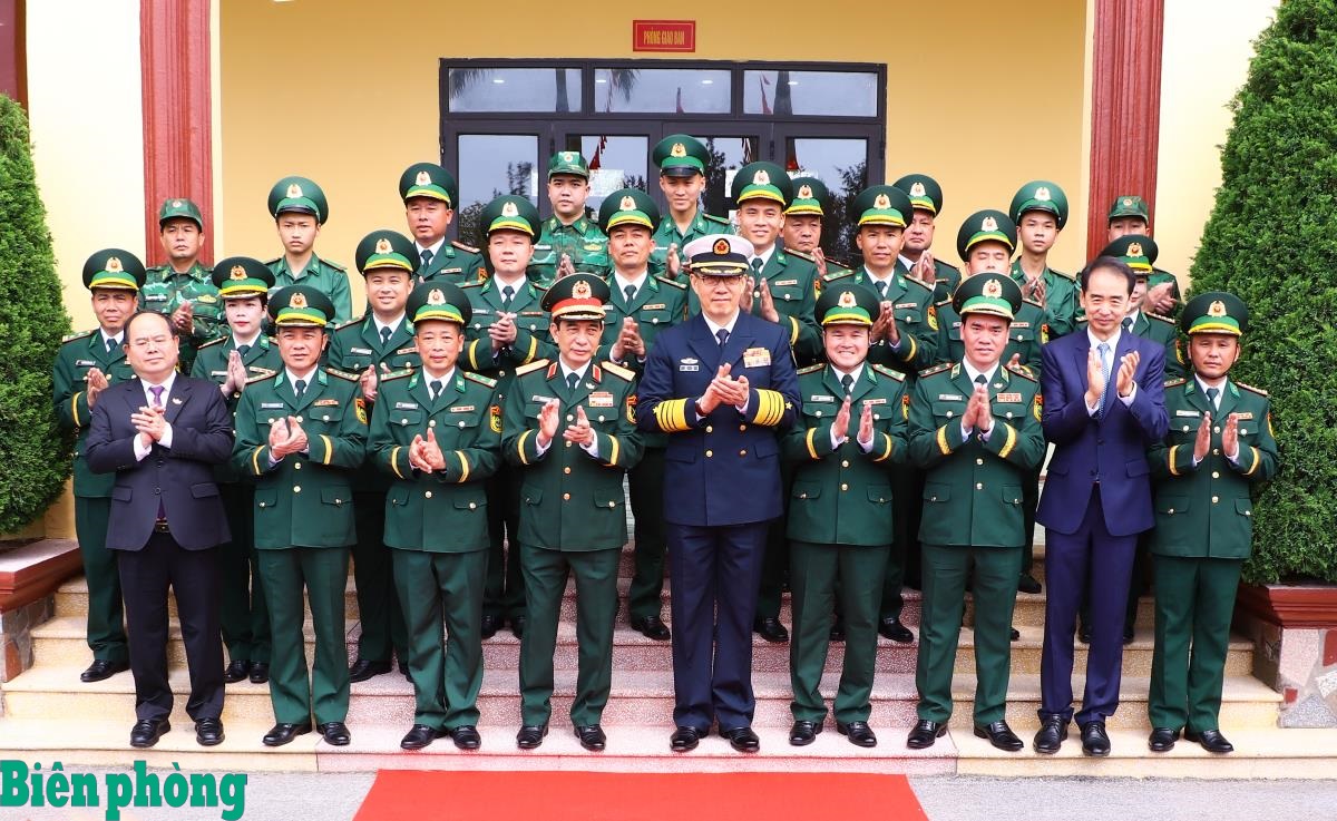 Đoàn đại biểu Bộ Quốc phòng Việt Nam - Trung Quốc chụp ảnh lưu niệm cùng cán bộ, chiến sĩ Đồn Biên phòng Trà Cổ.