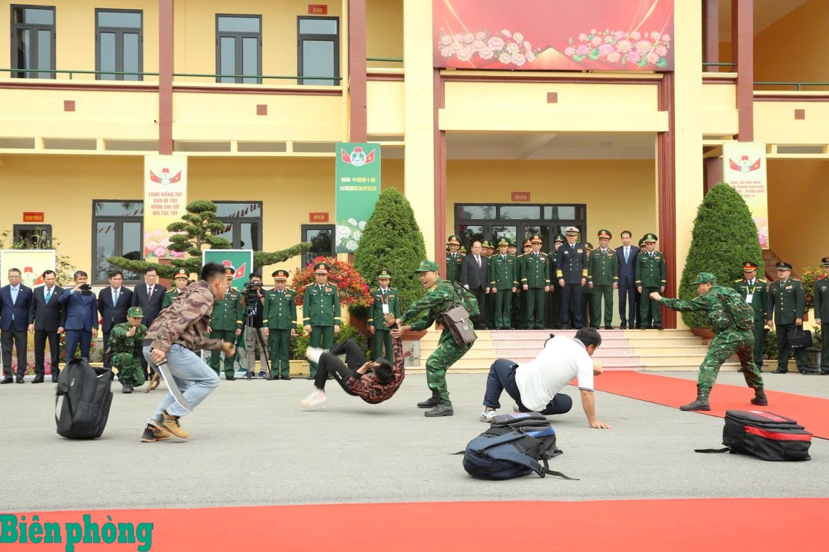 Ngay sau lễ đón tại Đồn Biên phòng Trà Cổ, các đại biểu tham quan đội mẫu thực hành tình huống Đội công tác Biên phòng sử dụng chó nghiệp vụ phát hiện, đánh bắt tội phạm ma túy.