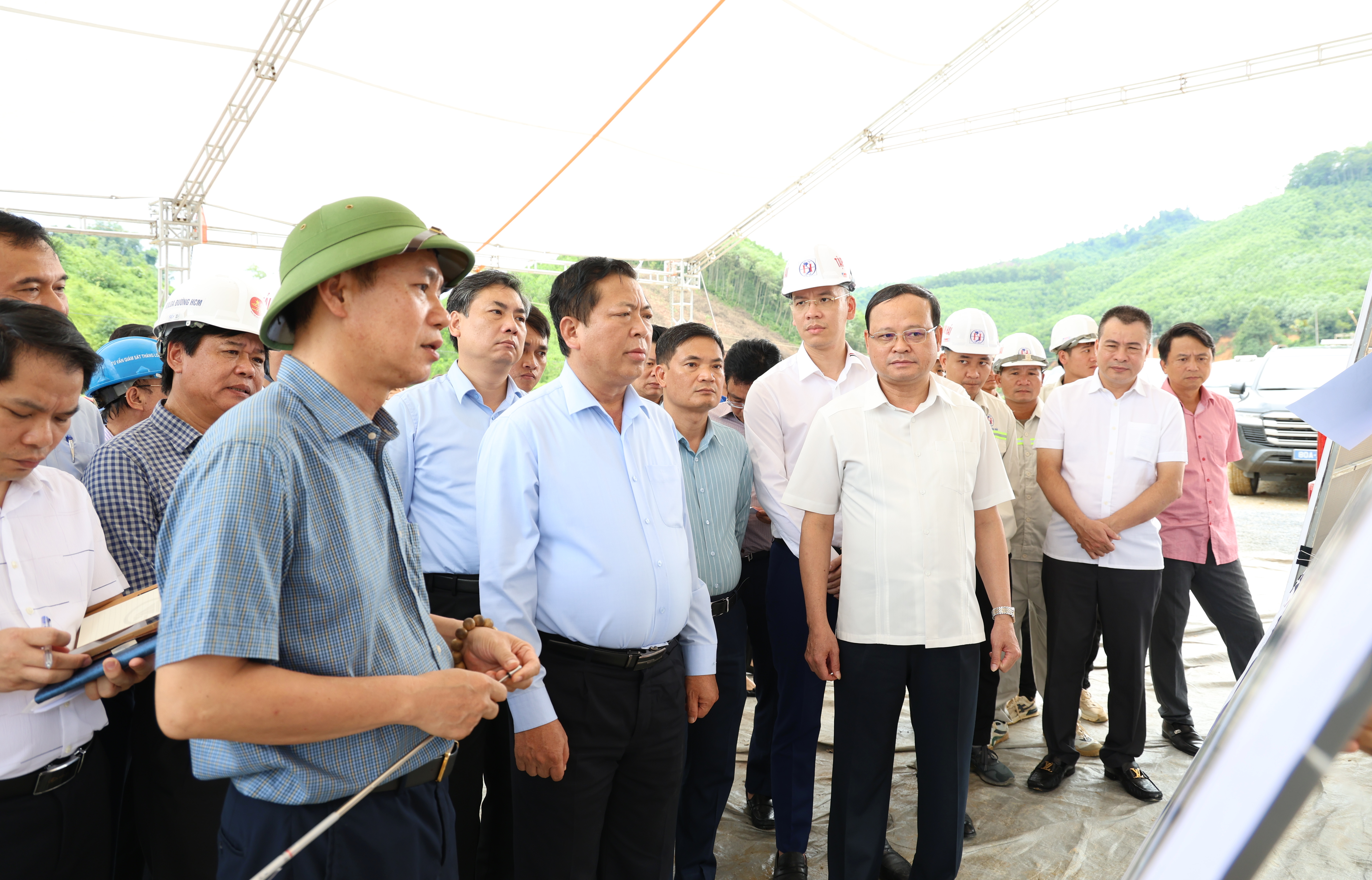 Bộ trưởng Bộ Xây dựng Trần Hồng Minh nghe báo cáo tiến độ triển khai dự án.