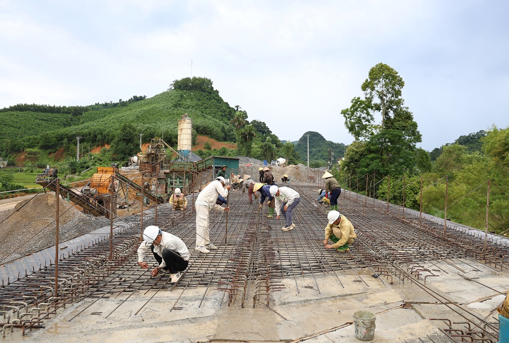 Công nhân thi công cầu Lâm Sơn đoạn ngã ba Trung Sơn đi Chợ Chu.