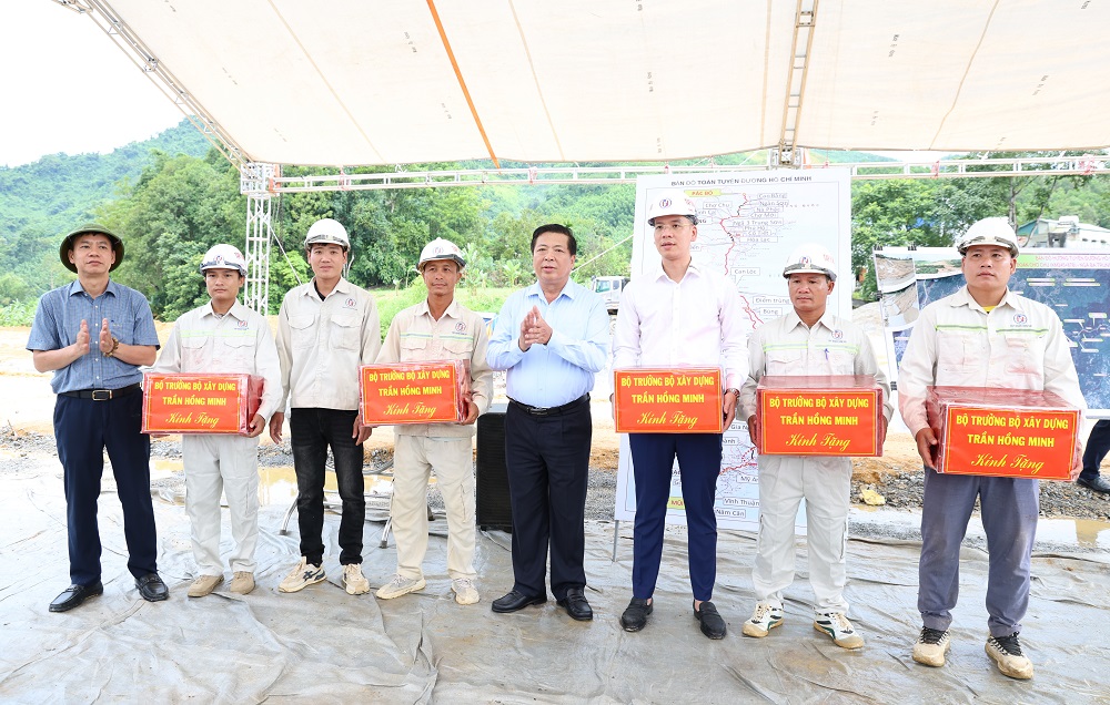 Bộ trưởng Bộ Xây dựng Trần Hồng Minh tặng quà động viên nhà thầu, công nhân thi công dự án.