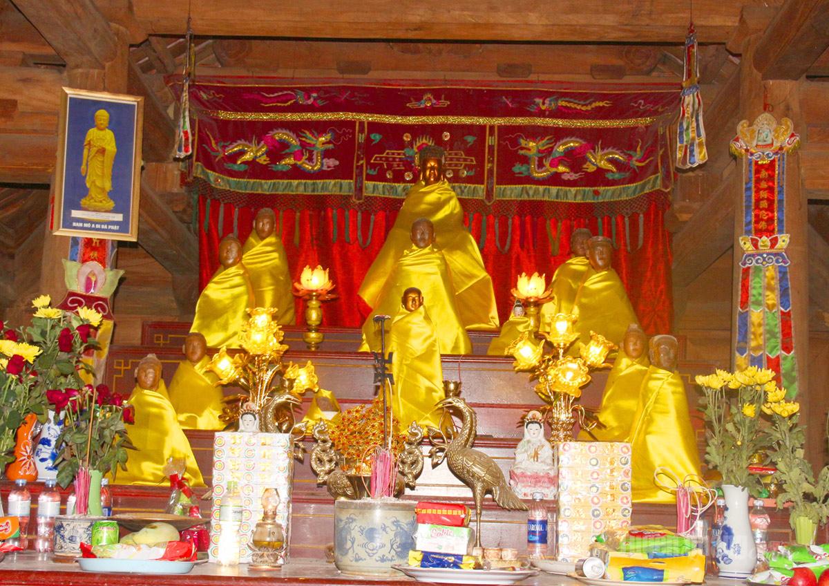 Khác với vẻ lộng lẫy thường thấy ở chốn vương giả miền xuôi, hàng chục pho tượng Phật nơi đây được tạc bằng gỗ nguyên khối, để mộc hoàn toàn ở tư thế ngồi thiền trên đài sen, không hề sơn son thếp vàng. Tượng có khuôn mặt nữ hiền từ, đầu búi tóc, mang dáng vẻ thô ráp, chân phương nhưng lại toát lên thần thái vô cùng có hồn và gần gũi. Lý giải về nét độc đáo này, Tiến sĩ Nguyễn Vũ Phan phân tích: “Phật ở miền xuôi người ta làm những pho tượng rất lớn, tai to mặt lớn, sơn son thếp vàng uy nghi. Nhưng ở miền núi thì họ chỉ tạc bằng gỗ rất đơn sơ, mộc mạc. Cái đó rất phù hợp với tính cách của người miền núi: đơn giản, mộc mạc và rất dễ gần”. Theo các nhà khảo cổ, đây là một trong số ít những bộ tượng thờ ở vùng núi phía Bắc có niên đại từ thế kỷ XIV còn được lưu giữ nguyên vẹn đến ngày nay.