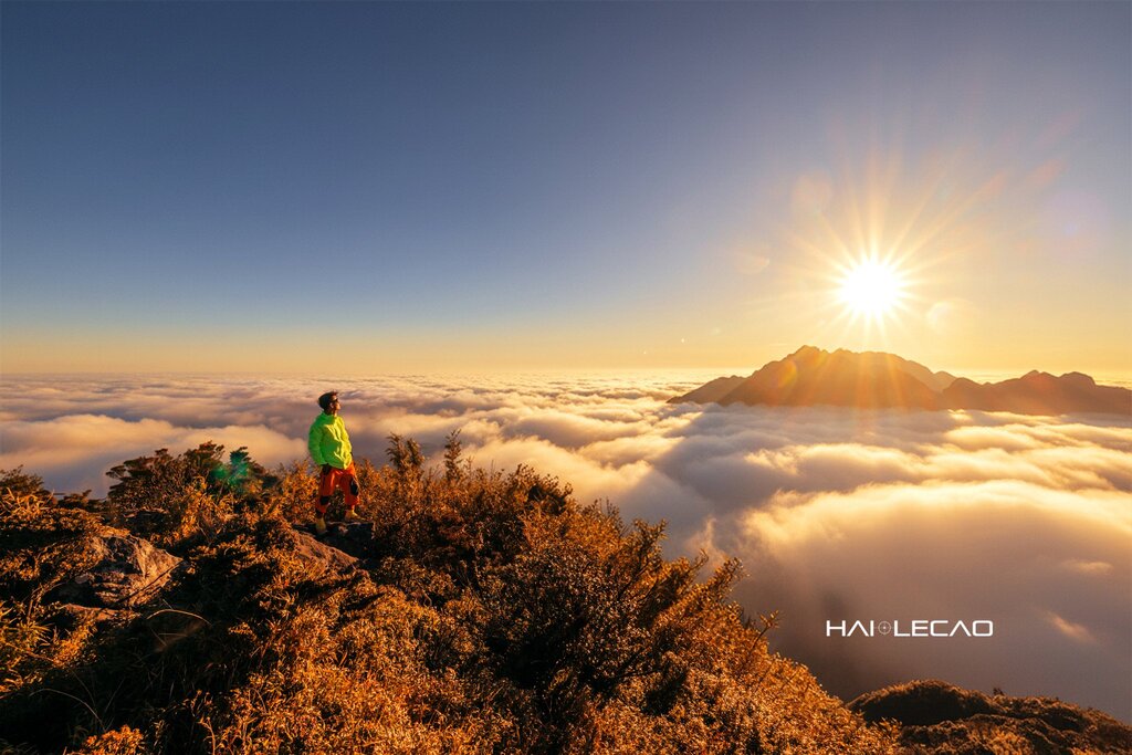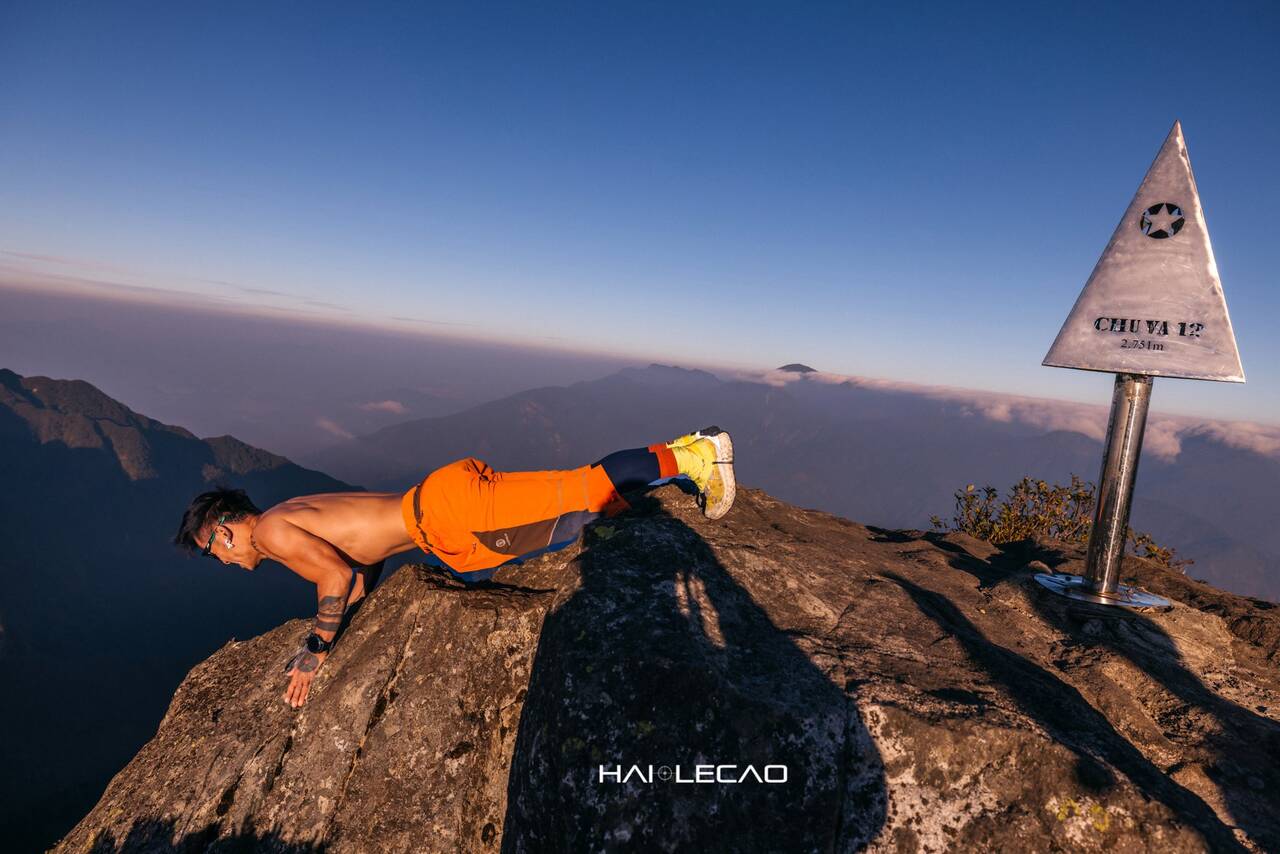 Nhiếp ảnh gia Lê Cao Hải chụp hình ấn tượng với đỉnh núi Chu Va 12 sau hành trình chinh phục đầy thách thức.