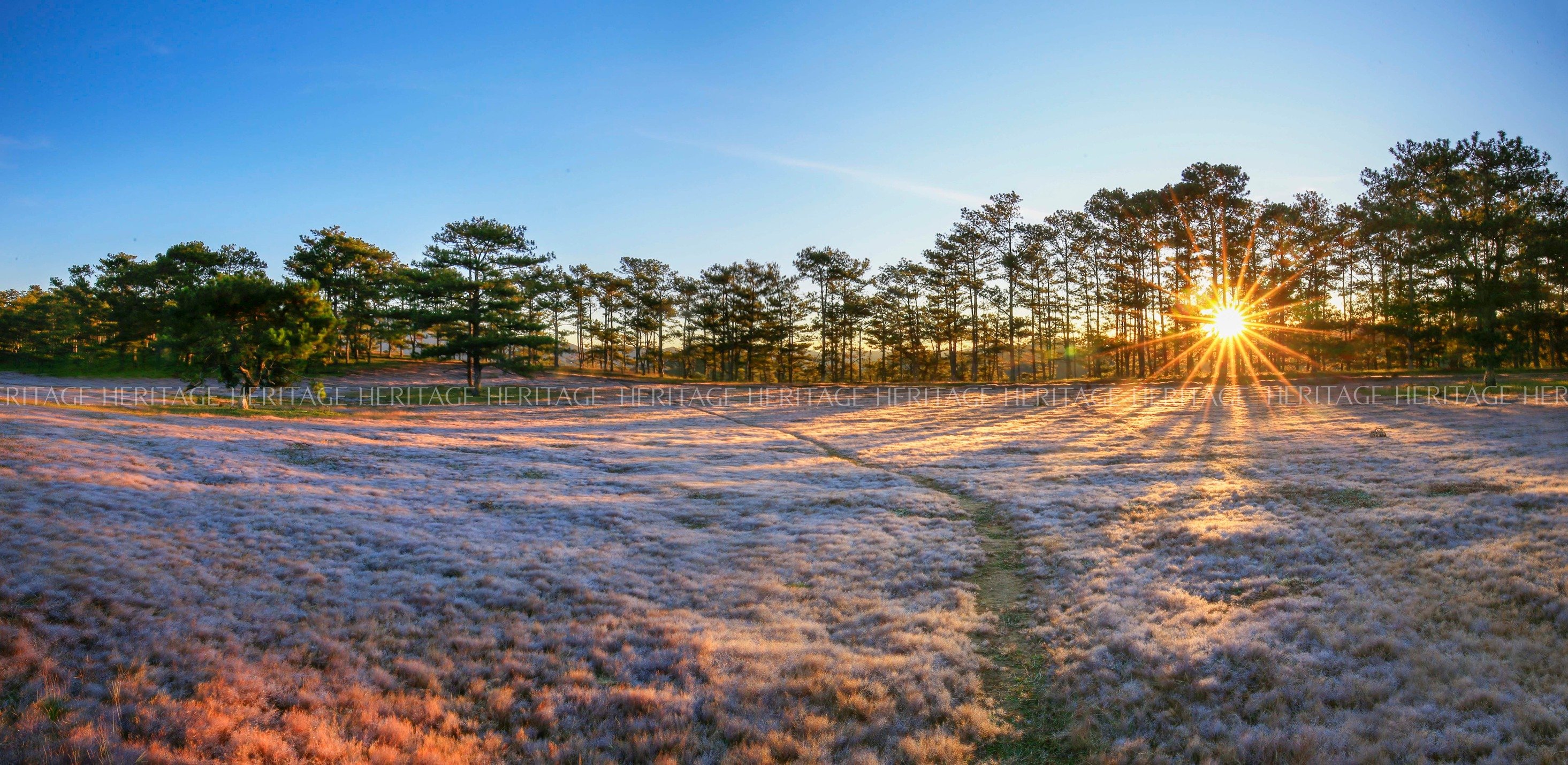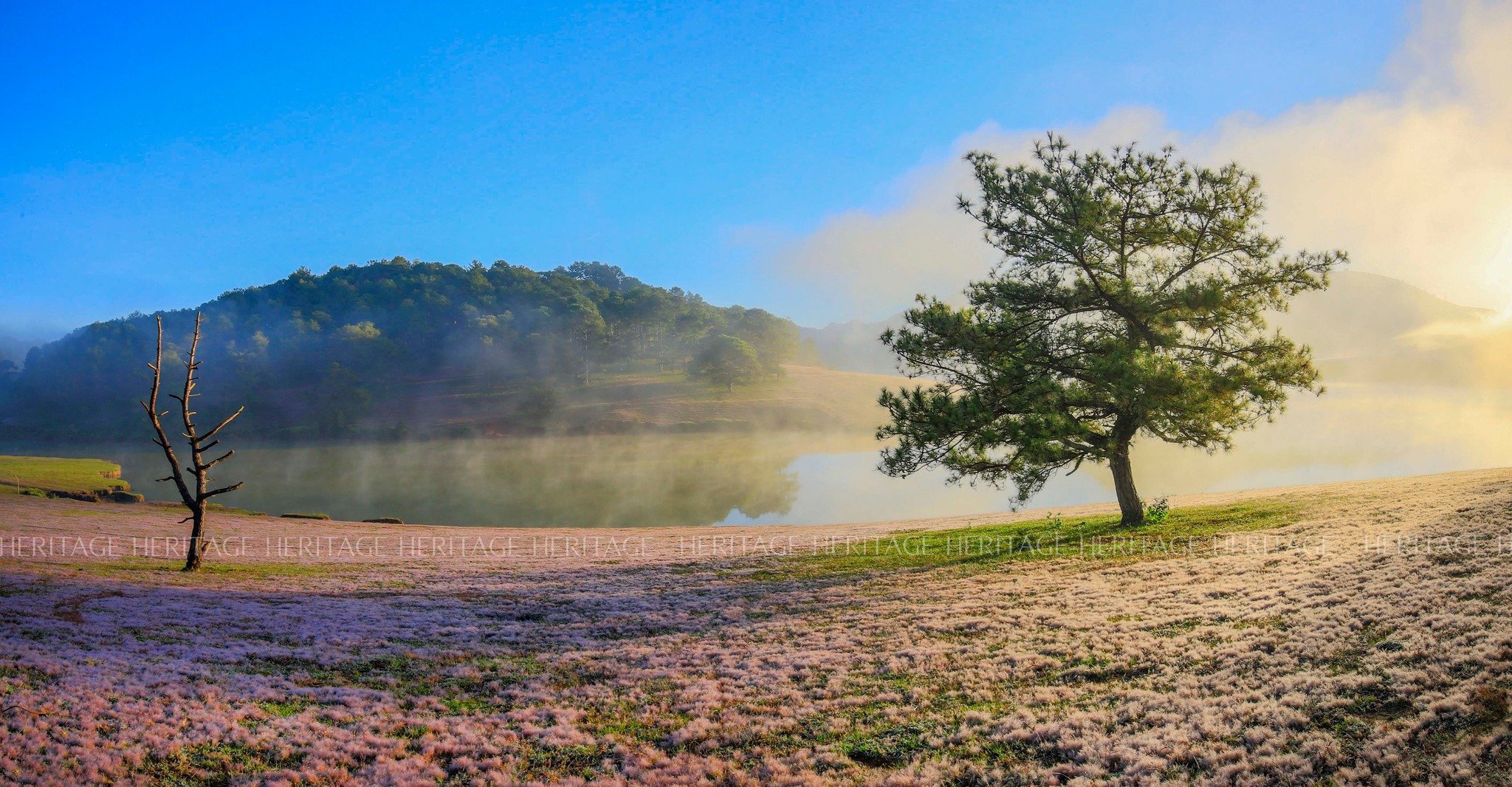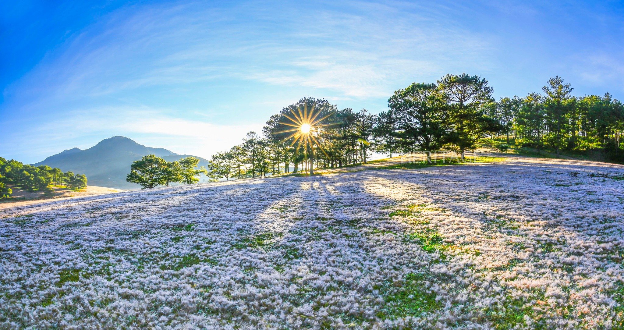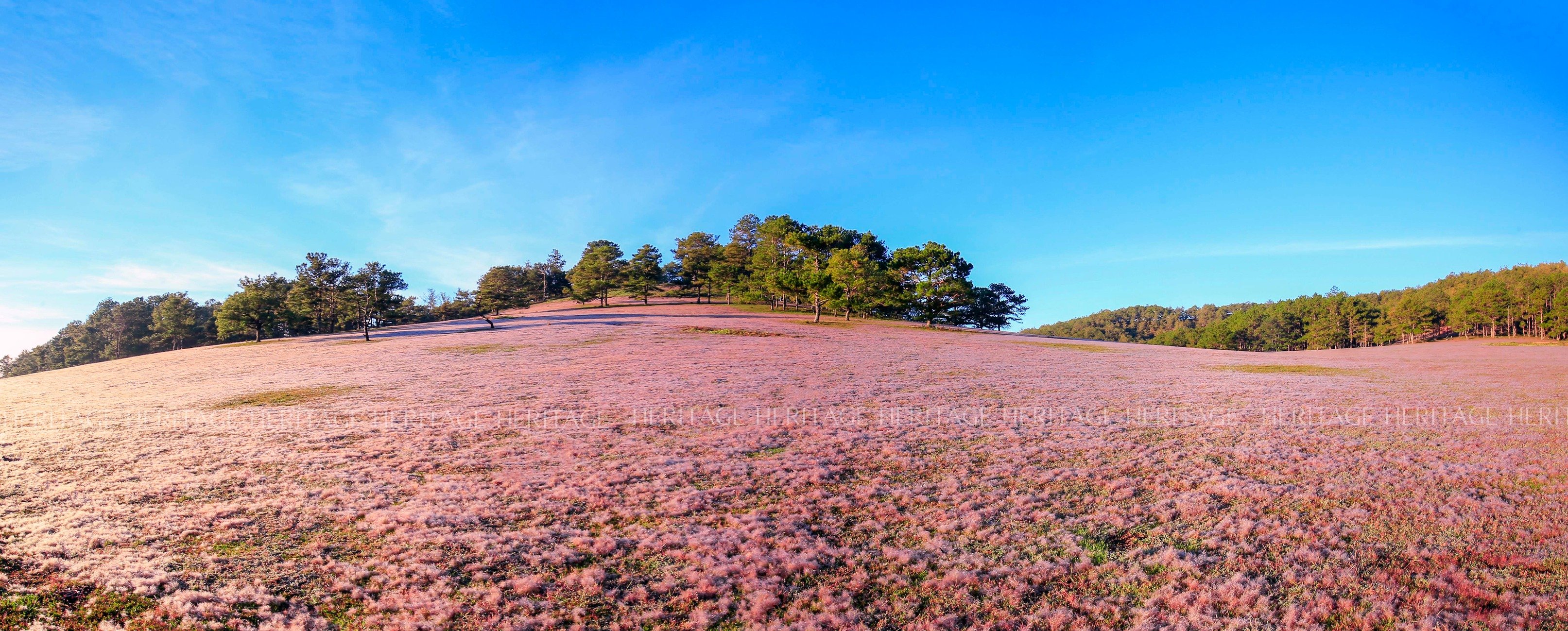 Sáng sớm là thời điểm đẹp nhất để săn hiệu ứng “cỏ tuyết”, cả sườn đồi như phủ tuyết vì ngậm đầy sương li ti trên từng ngọn cỏ hồng. Khi nắng lên cao hơn, cỏ hồng rõ màu và rực rỡ hơn.