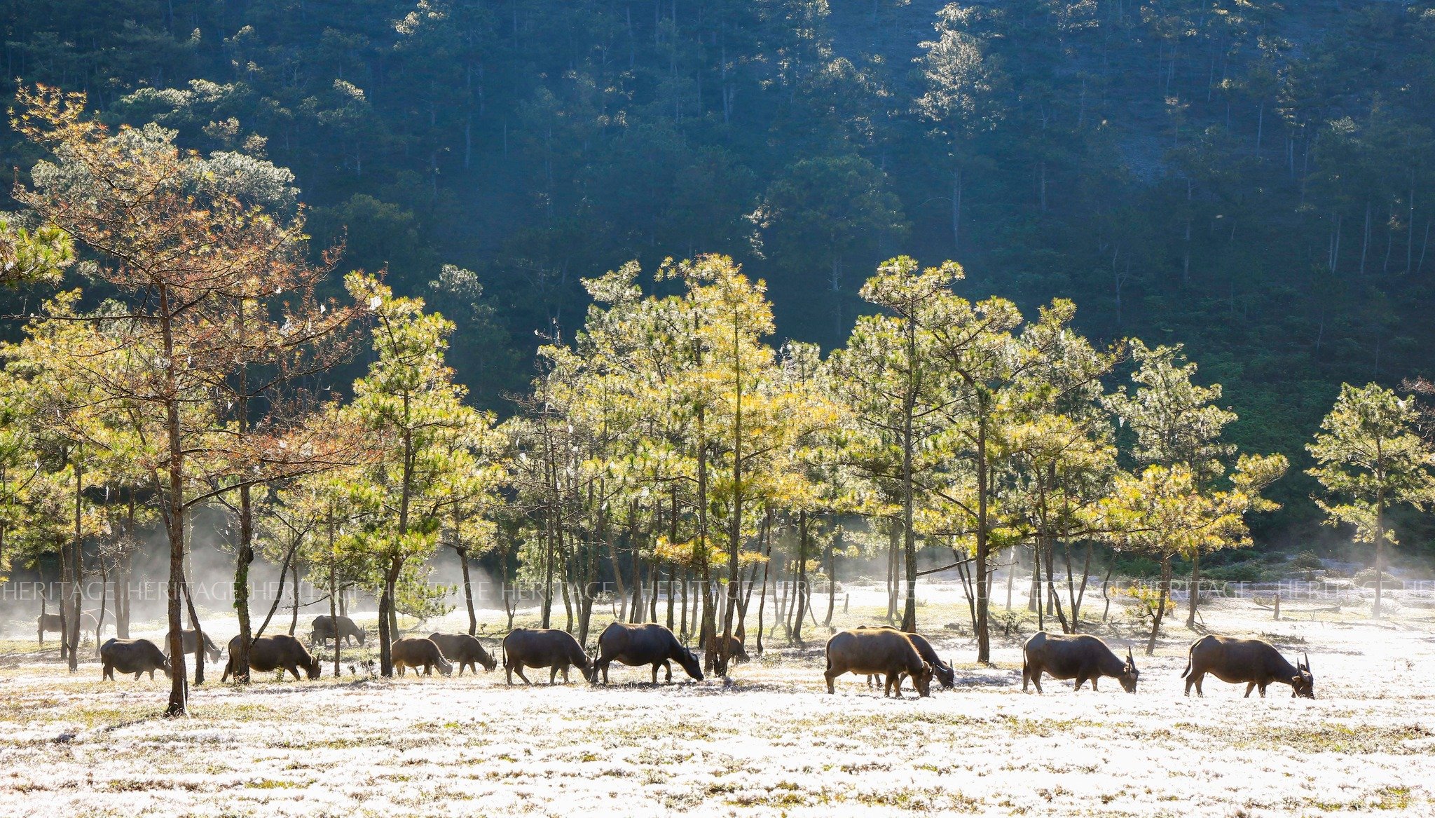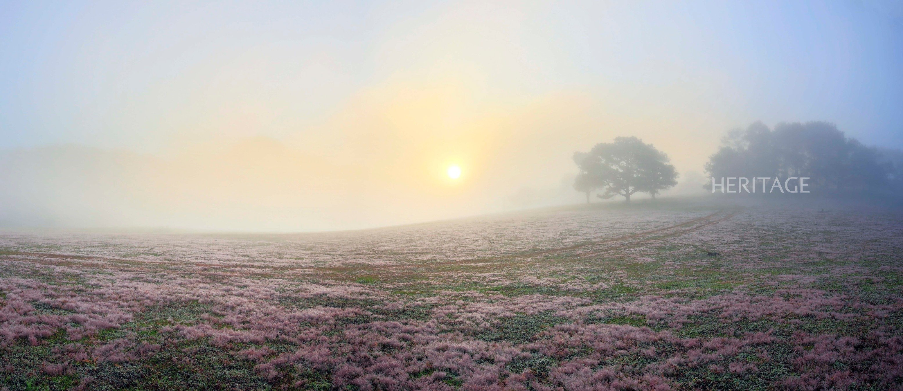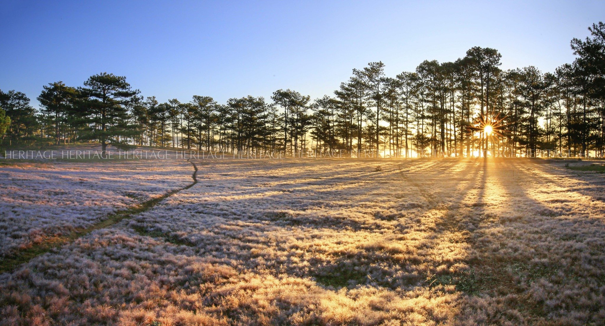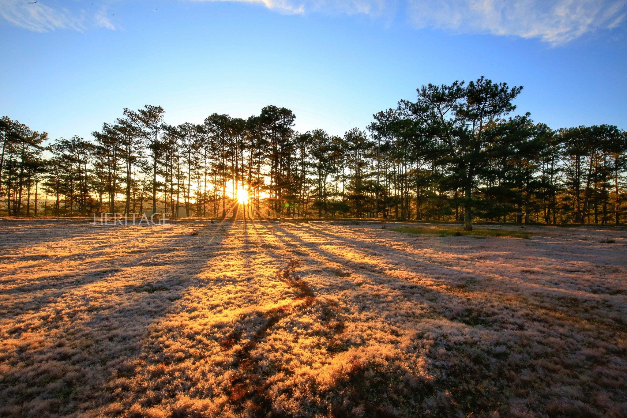Sáng sớm là thời điểm đẹp nhất để săn hiệu ứng “cỏ tuyết”, cả sườn đồi như phủ tuyết vì ngậm đầy sương li ti trên từng ngọn cỏ hồng. Khi nắng lên cao hơn, cỏ hồng rõ màu và rực rỡ hơn.