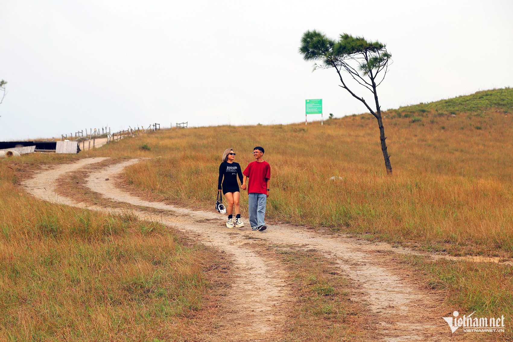 Những sườn đồi vốn xanh mướt nay chuyển sang màu vàng cam rực rỡ. Lớp cỏ cháy khô xào xạc dưới chân, ánh lên sắc đồng khi nắng sớm chiếu xuống.