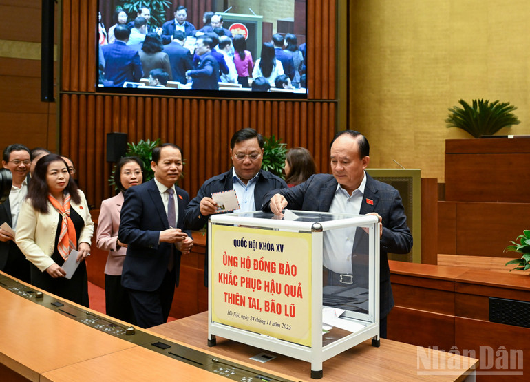 Đầu giờ sáng 24/11, tại Nhà Quốc hội, trước khi Quốc hội tiếp tục chương trình làm việc của Kỳ họp thứ 10, Ủy ban Thường vụ Quốc hội tổ chức Lễ phát động, quyên góp ủng hộ đồng bào khắc phục hậu quả do thiên tai, bão lũ.