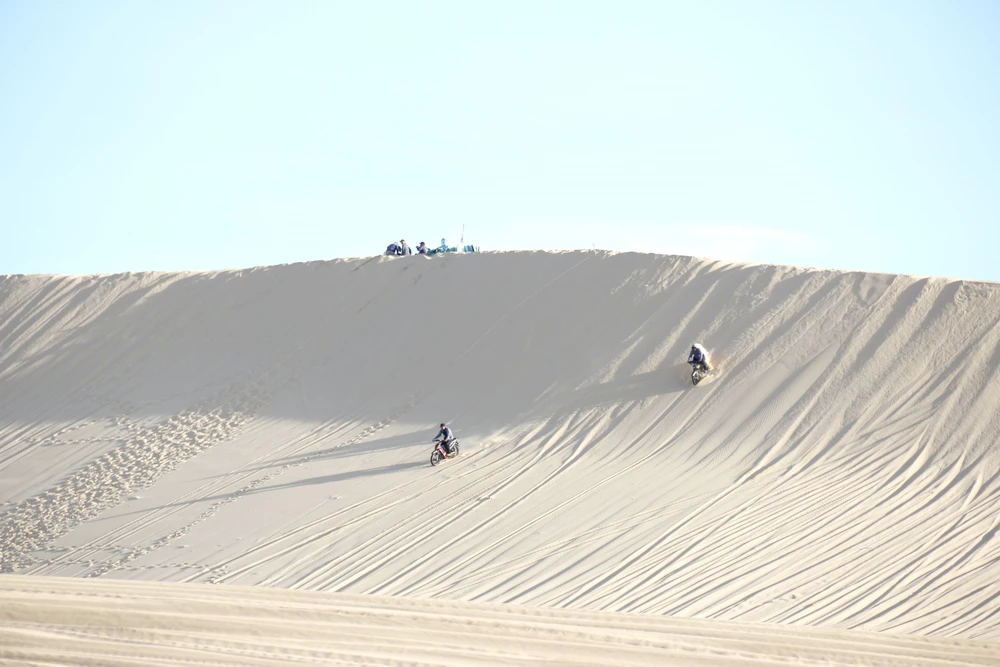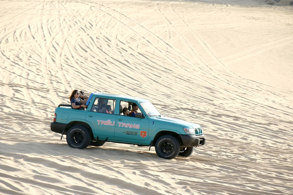 Trải nghiệm đi xe địa hình vượt đồi cát Bàu Trắng, mang lại cảm giác mạnh cho du khách. (Ảnh: Nguyễn Thanh/TTXVN