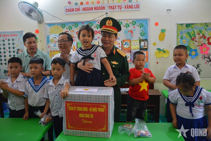 Đoàn công tác, đại diện chỉ huy các cơ quan, đơn vị Quân đội cũng trao tặng nhiều phần quà của Bộ Quốc phòng, Tổng cục Chính trị và các đơn vị đến quân và dân ở Đặc khu Trường Sa, Nhà giàn DK1/15.