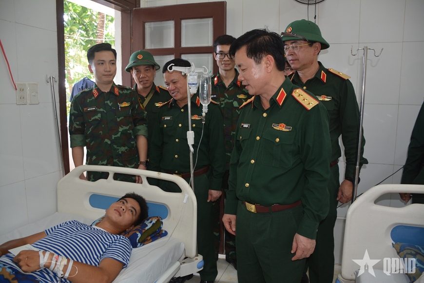 Thượng tướng Đỗ Xuân Tụng thăm các chiến sĩ đang nằm điều trị tại Bệnh xá Trung tâm đảo Nam Yết.