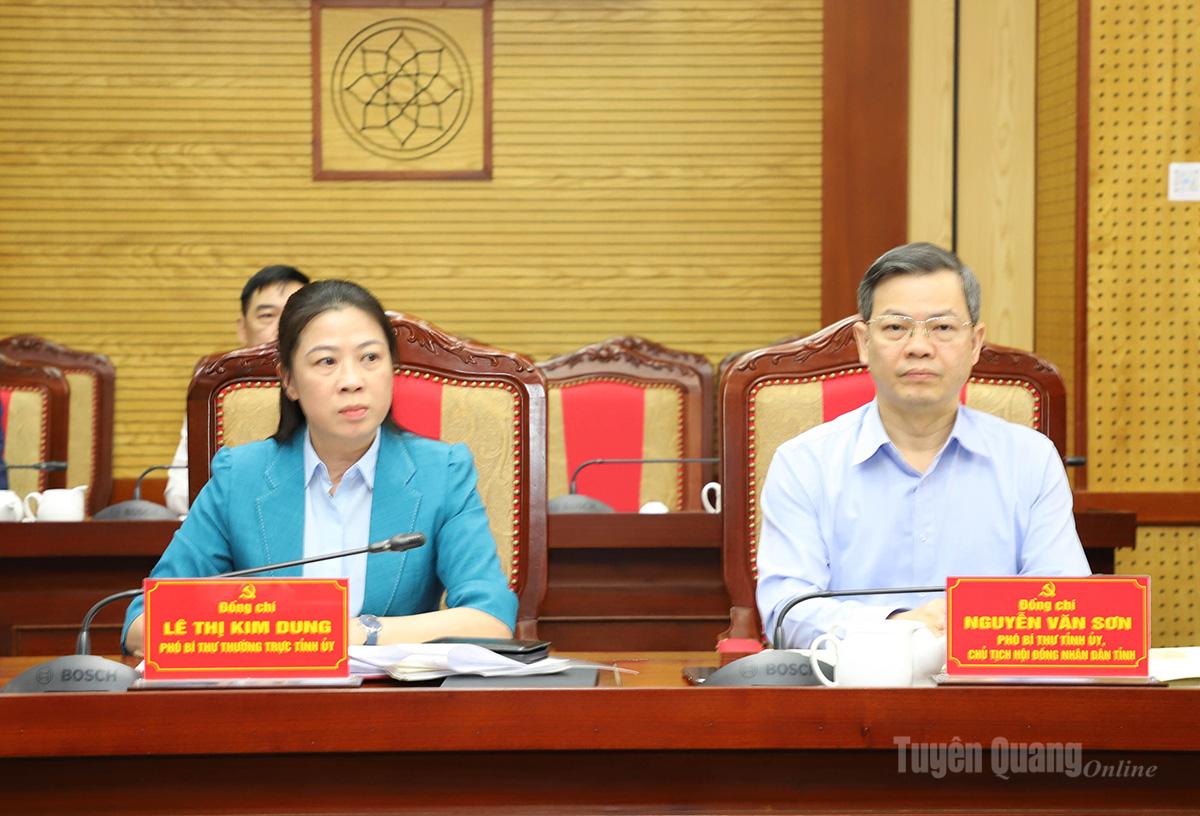 Phó Bí thư Thường trực Tỉnh ủy Lê Thị Kim Dung và Phó Bí thư Tỉnh ủy, Chủ tịch HĐND tỉnh Nguyễn Văn Sơn dự buổi làm việc.