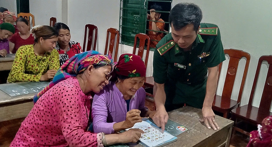 Đoàn thanh niên Đồn Biên phòng Tùng Vài tham gia xóa mù chữ cho nhân dân.