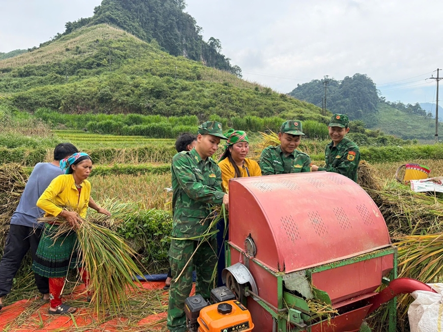 Đoàn viên thanh niên Đồn Biên phòng Thàng Tín giúp nhân dân thu hoạch lúa.
