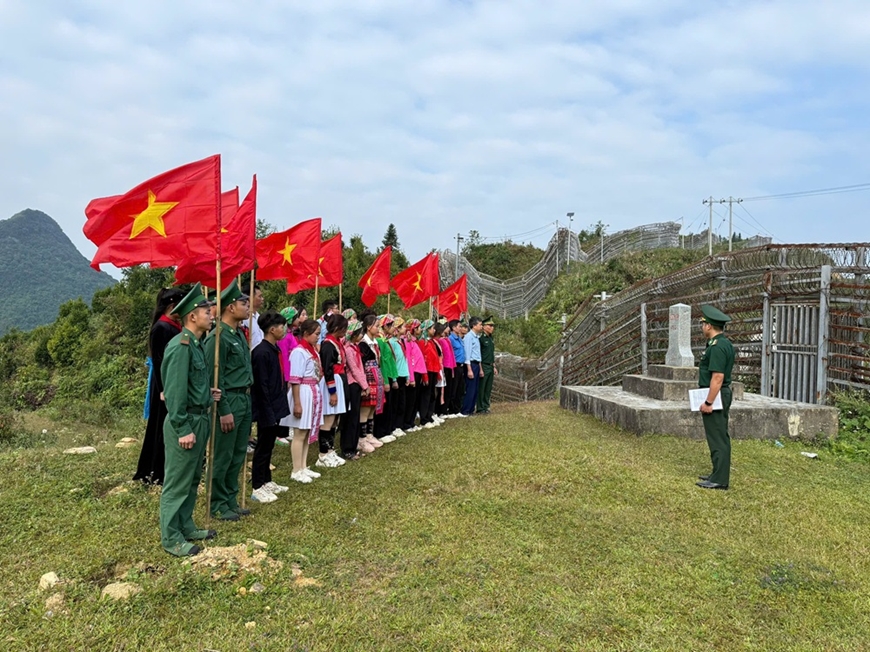Đoàn thanh niên Đồn Biên phòng Sơn Vĩ giới thiệu về đường biên, cột mốc cho học sinh trải nghiệm.