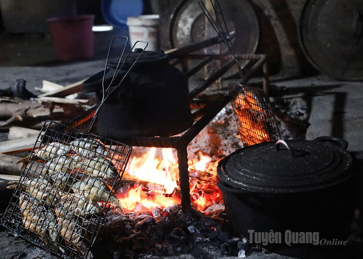 Cá chép nướng than được đặt cạnh bếp lật đều cho đến khi lớp da vàng ruộm, giòn tan, tỏa mùi thơm.