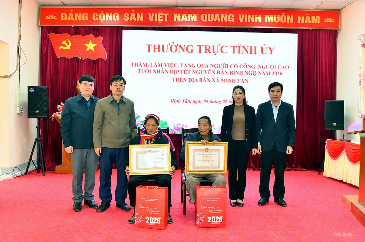 cùng các thành viên đoàn công tác trao Mừng thọ của Chủ tịch UBND tỉnh cho các cụ cao niên xã Minh Tân.