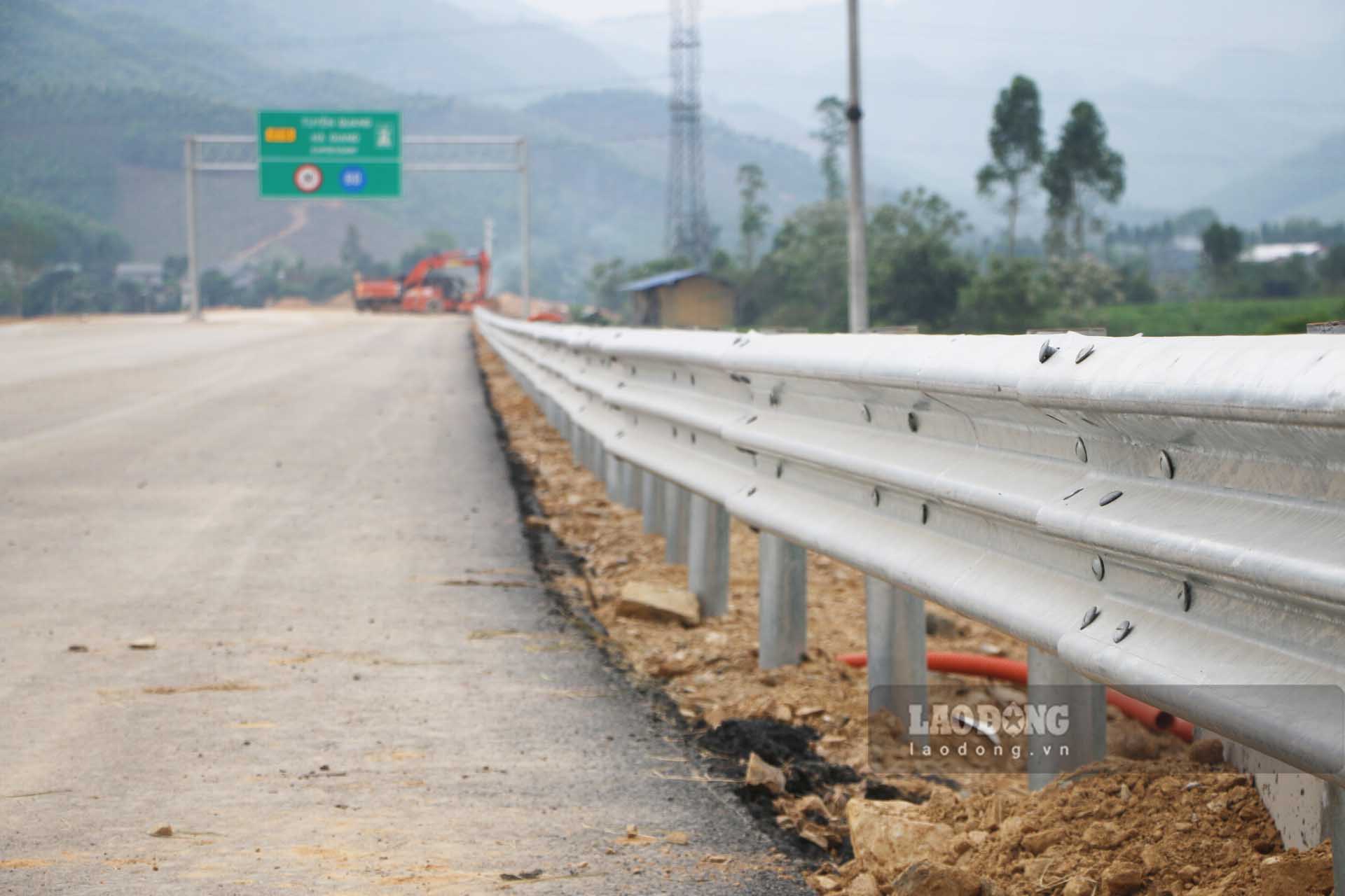 Hiện nay, nhiều vị trí mặt đường đã được thảm bê tông nhựa lớp 1. Các hạng mục phụ trợ đảm bảo an toàn giao thông như hộ lan, biển báo chỉ dẫn đang được nhà thầu lắp đặt.