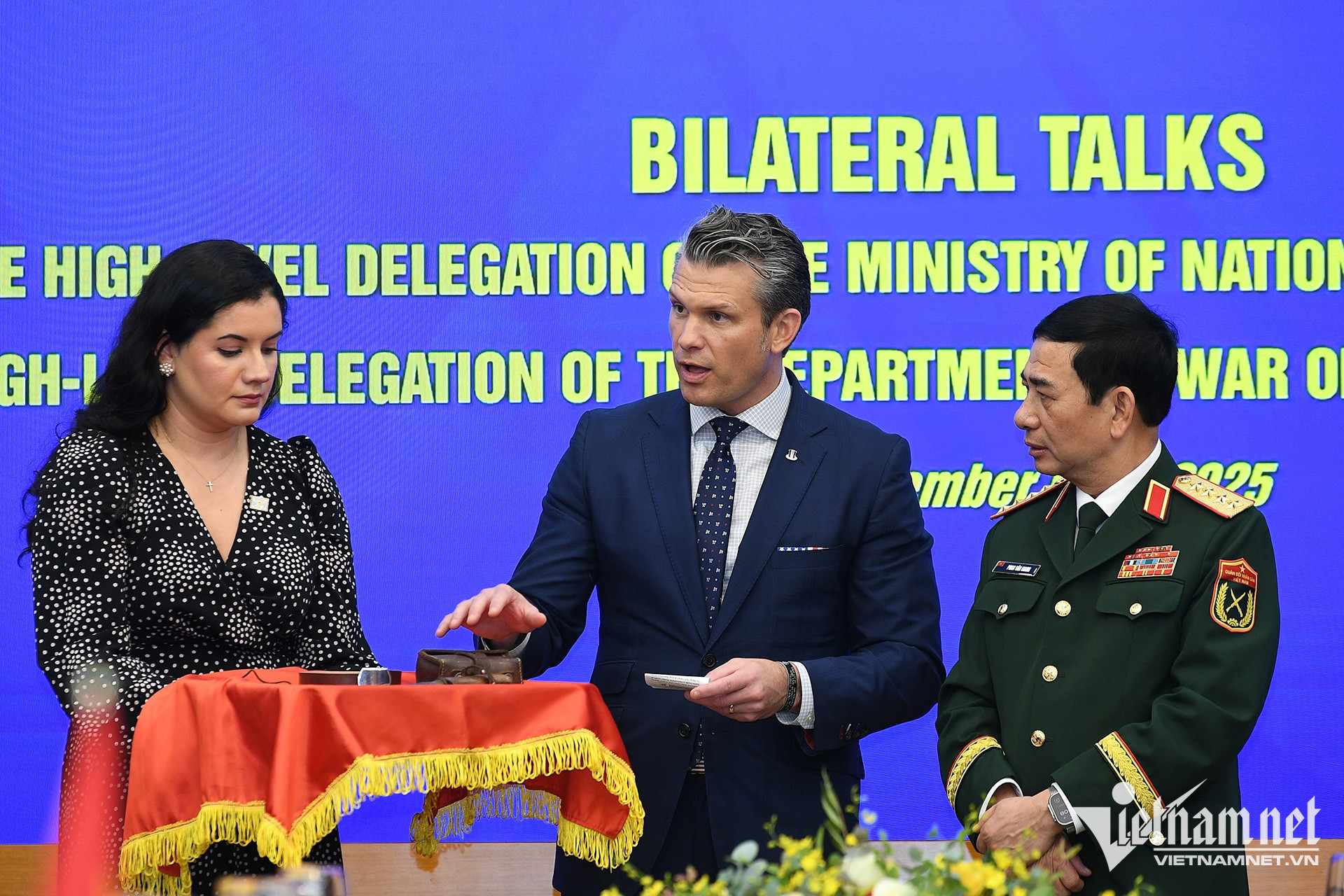Bộ trưởng Bộ Chiến tranh Mỹ Pete Hegseth cùng trao đổi kỷ vật chiến tranh