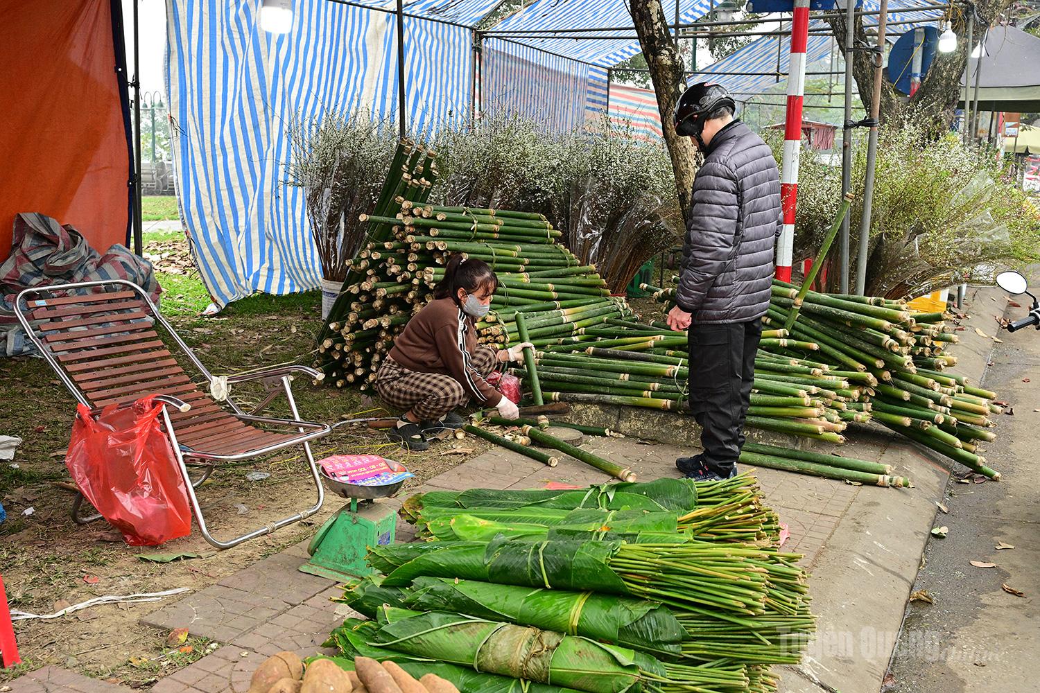 Lá dong và cây giang về chẻ lạt được bày bán nhiều ở khu vực chợ Tam Cờ.