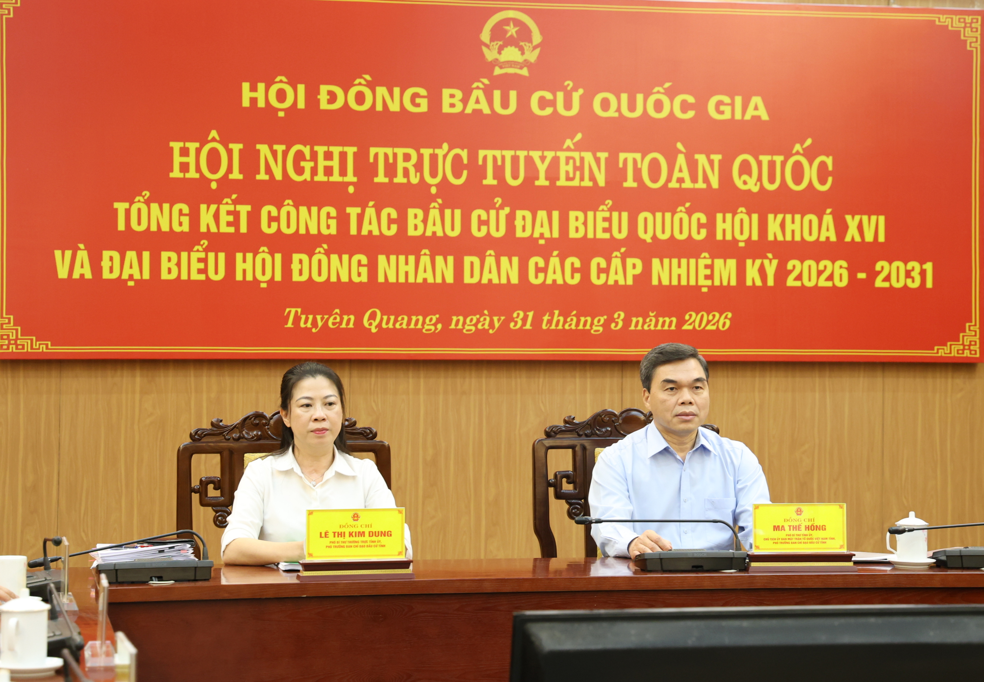 Các đồng chí: Lê Thị Kim Dung, Phó Bí thư Thường trực Tỉnh ủy, Phó trưởng Ban Chỉ đạo bầu cử tỉnh; Ma Thế Hồng, Phó Bí thư Tỉnh ủy, Chủ tịch Ủy ban MTTQ tỉnh, Phó trưởng Ban Chỉ đạo bầu cử tỉnh dự, chủ trì hội nghị tại điểm cầu Tuyên Quang.