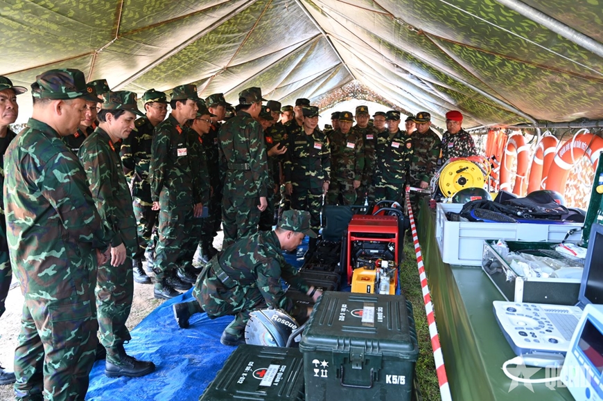 Đại biểu tham quan gian trưng bày trang bị, khí tài cứu hộ, cứu nạn của QĐND Việt Nam.