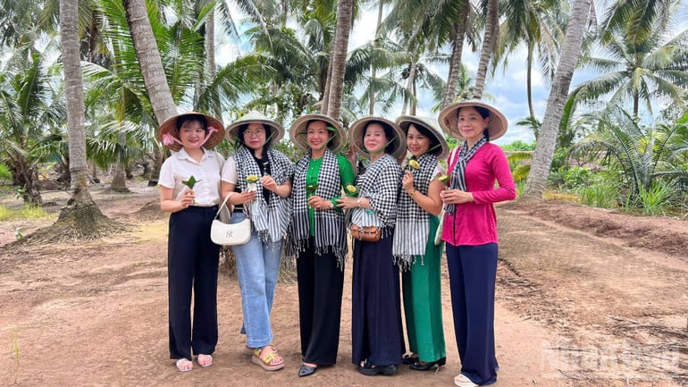 Du khách chụp ảnh lưu niệm bên vườn dừa.