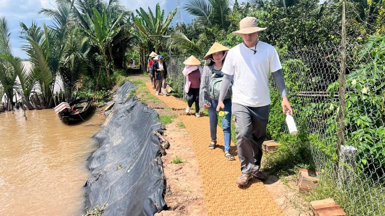 Du khách trải nghiệm đi trên đường đất được lót bằng thảm chỉ xơ dừa.