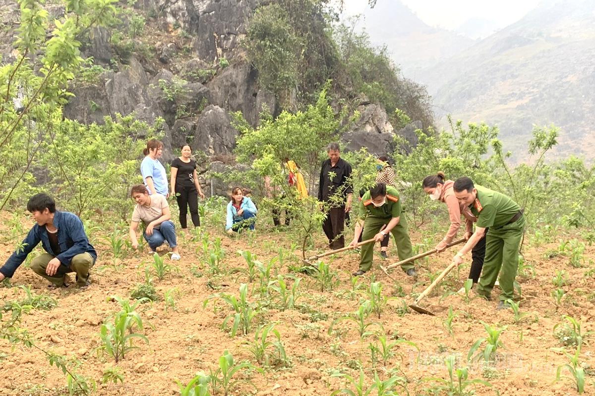 Công an xã Thắng Mố tuyên truyền, giúp người dân cải tạo vườn tạp. Ảnh: Hoàng Hà