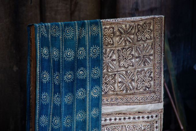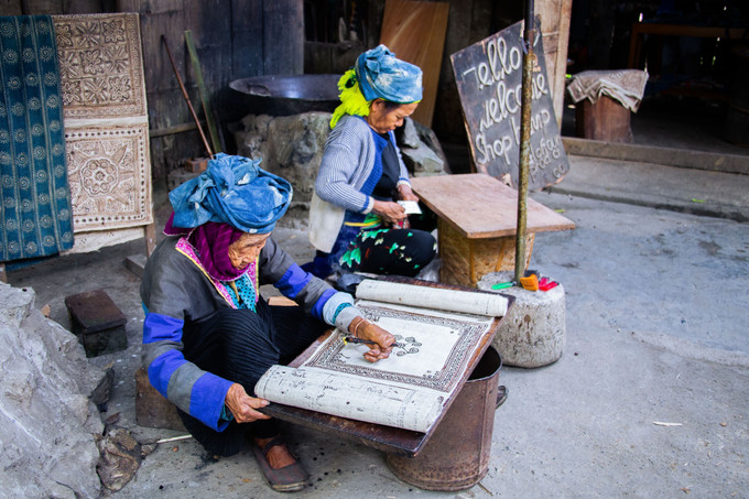 Tỉ mỉ vẽ hoa văn bằng sáp ong trên vải lanh, công đoạn đòi hỏi sự khéo léo và kinh nghiệm lâu năm.