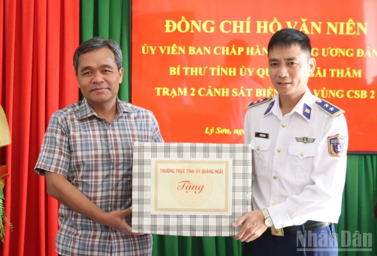 Đồng chí Hồ Văn Niên, Ủy viên Trung ương Đảng, Bí thư Tỉnh ủy Quảng Ngãi tặng quà cho Hải đội dân quân thường trực biển.