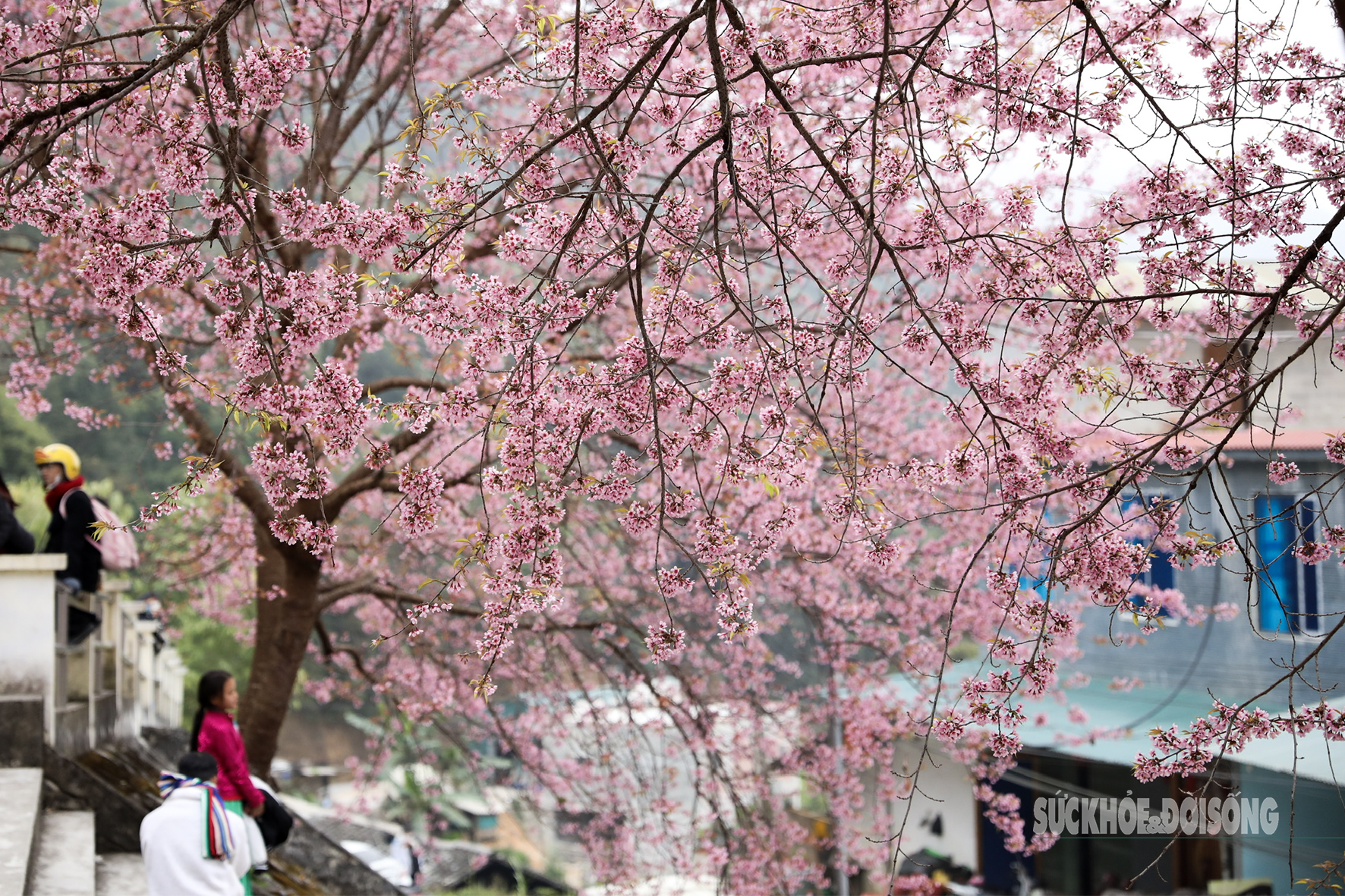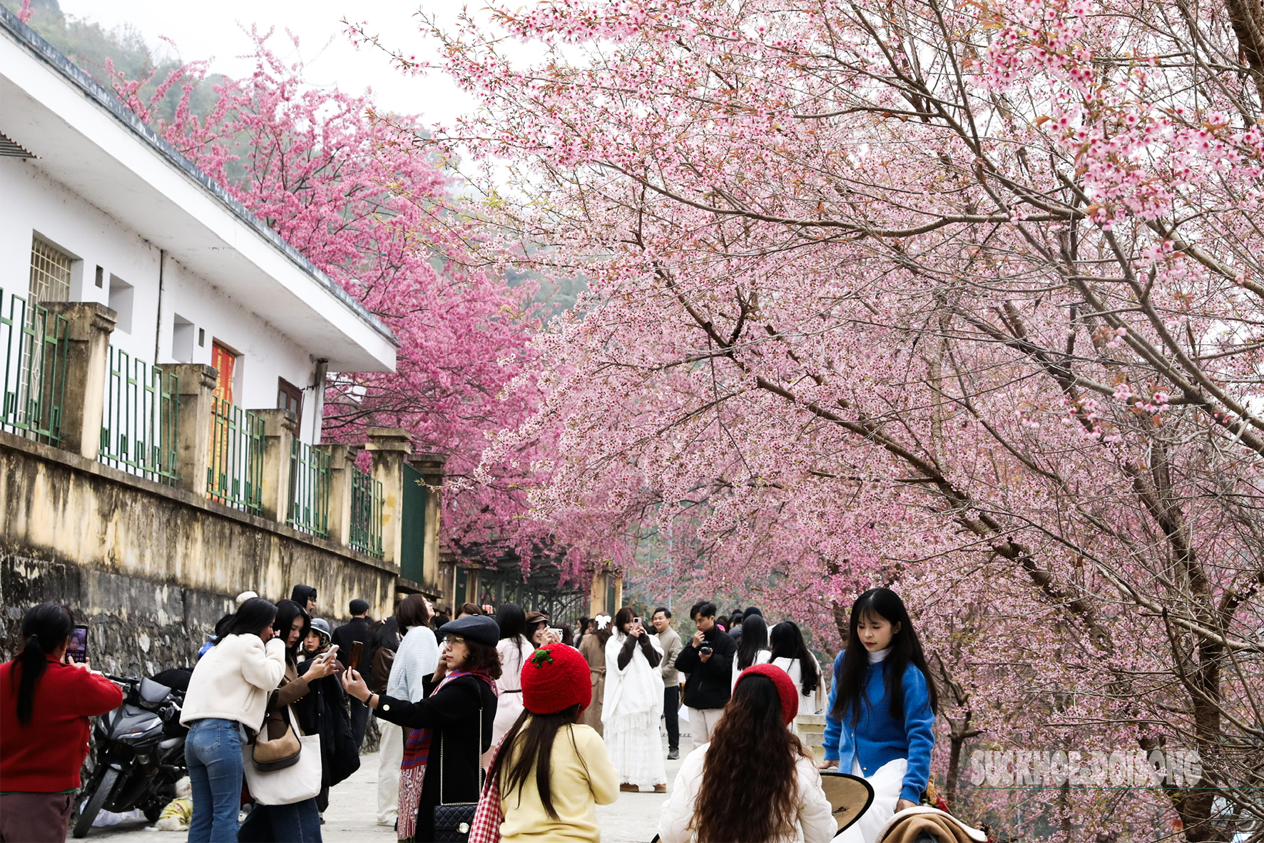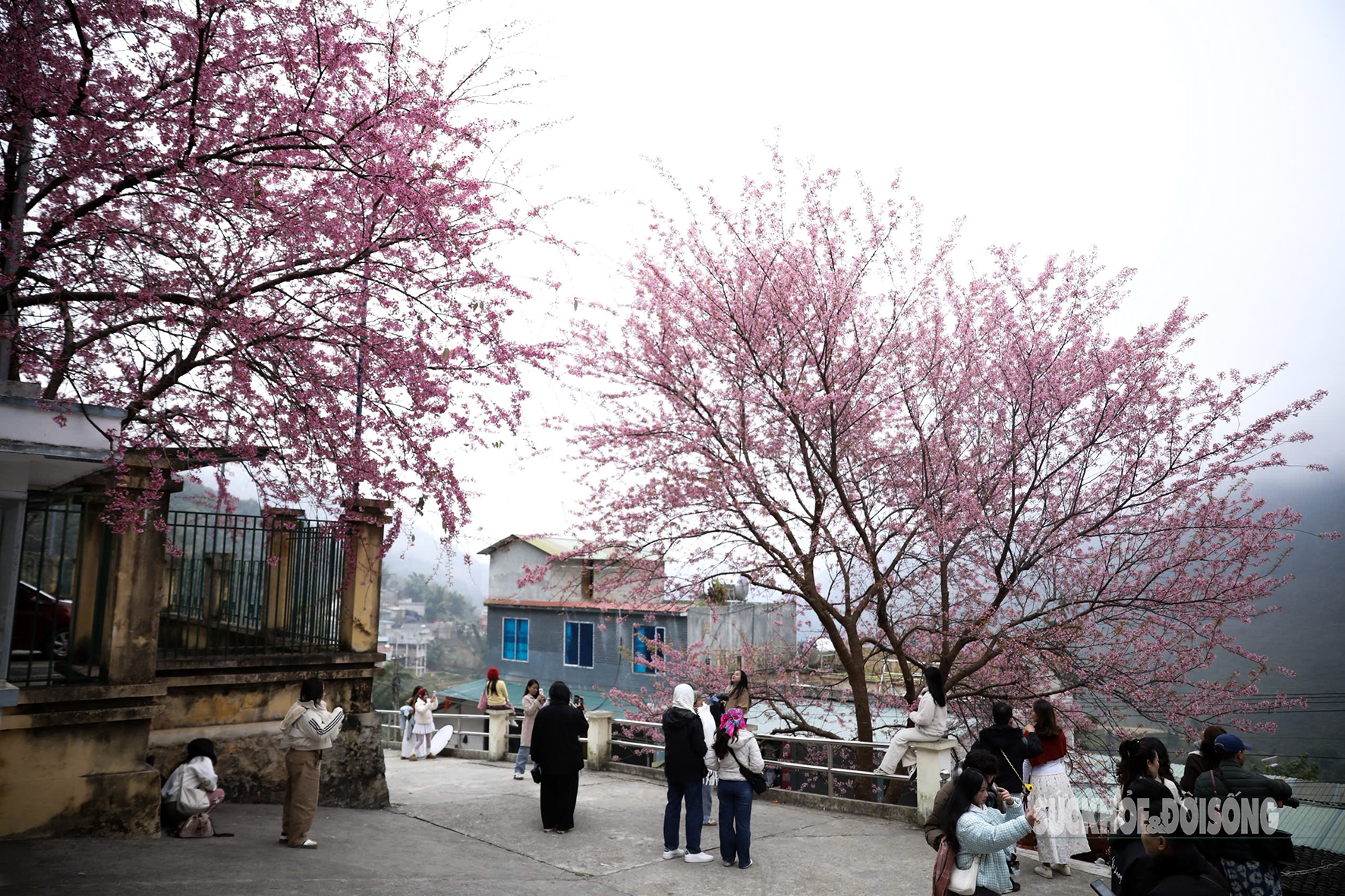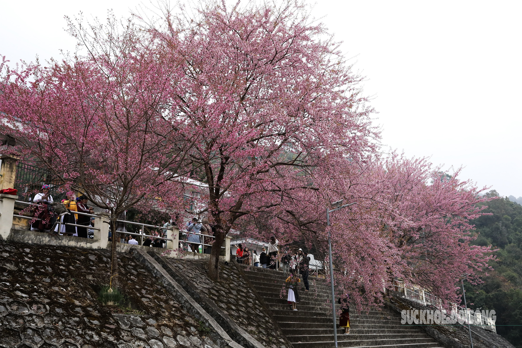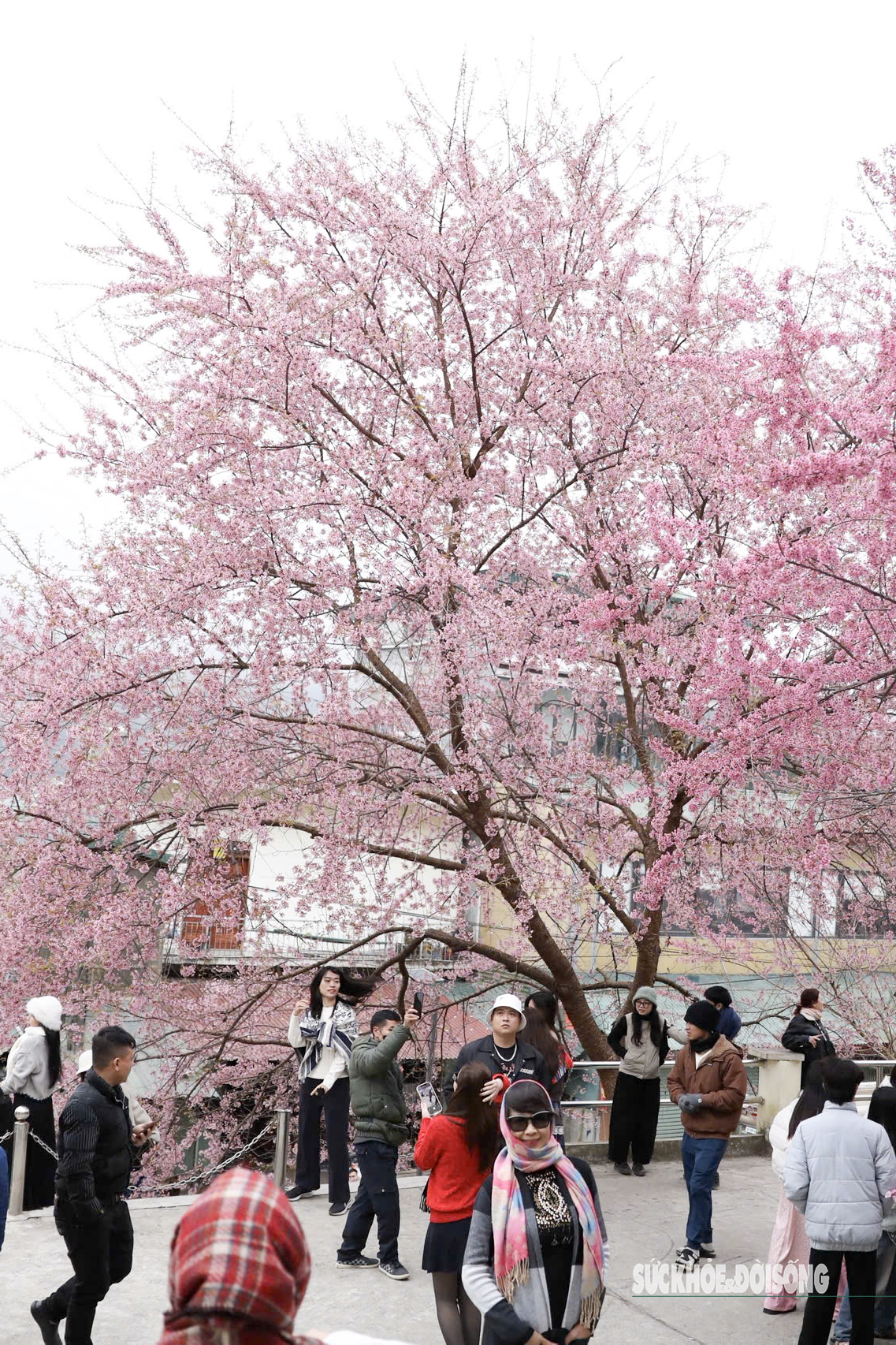 Mai anh đào bung nở rực hồng, trở thành "phông nền" hút khách, nhiều nhóm đứng xếp lượt để chụp ảnh dưới tán hoa.