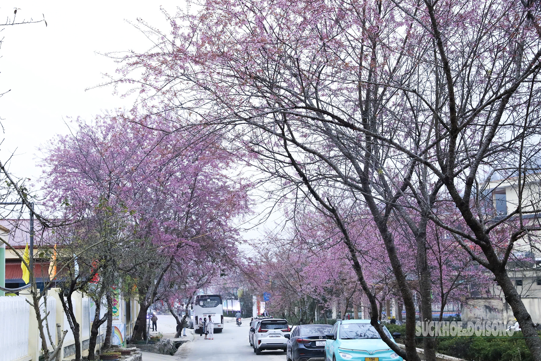 Dọc tuyến đường quanh khu vực, hàng cây phủ sắc hồng tạo thành "đường hoa" giữa sương núi.