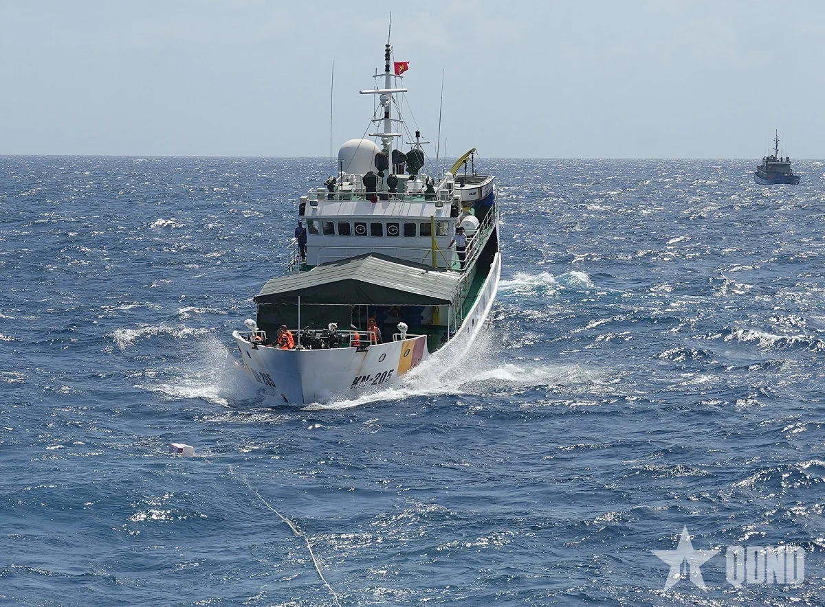 Qua bộ đàm, giọng nói của Trung tướng Bùi Quốc Oai vang lên ấm áp. Những lời chúc Tết gửi đi giữa mênh mông sóng gió. Từ phía bên kia, Thuyền trưởng Tàu BT 98393 TS không giấu được xúc động, gửi lời cảm ơn và những lời chúc tốt đẹp nhất tới đồng chí Chính ủy CSB cùng đoàn công tác. Những thùng quà Tết, những cành mai vàng được bọc kín bằng nhiều lớp túi ni lông, buộc dây chắc chắn rồi thả trôi theo chiều sóng trong sự phối hợp nhịp nhàng của hai con tàu. Mai vàng chao nhẹ theo sóng, nổi bật giữa màu xanh thẳm của biển, tựa như một lát cắt mùa xuân đang vượt qua sóng gió để đến với người lính biển giữa mênh mông trùng khơi.