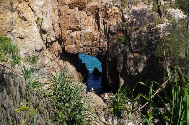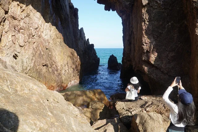 Quá trình phong hóa, tác động của thời gian và sóng biển đã đục một lỗ lớn trên vách đá tạo thành "cánh cổng" tự nhiên