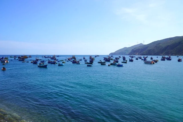 Từ đỉnh Mũi Vi Rồng, tầm mắt mở rộng ra biển khơi với cảnh thuyền cá ra vào tấp nập, bãi cát trải dài và hàng dừa xanh rì rào trong gió. Không gian nơi đây vừa hùng vĩ, vừa khoáng đạt, mang lại cảm giác thư thái hiếm có.