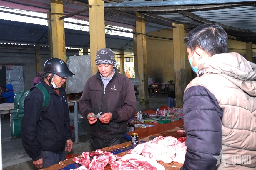 Trong kỳ nghỉ lễ, tại chợ phiên biên giới Sơn Vĩ, chúng tôi gặp ông Sùng Mí Pó (thôn Khai Hoang 2, xã Sơn Vĩ). Người đàn ông lớn tuổi tươi cười, tay xách túi thịt lợn vừa mua. Ông bảo, năm nay con trai và con dâu đi làm tận Hải Phòng được nghỉ lễ về thăm nhà, nên ông tranh thủ xuống chợ mua thêm “một cân thịt” để làm bữa cơm gia đình.