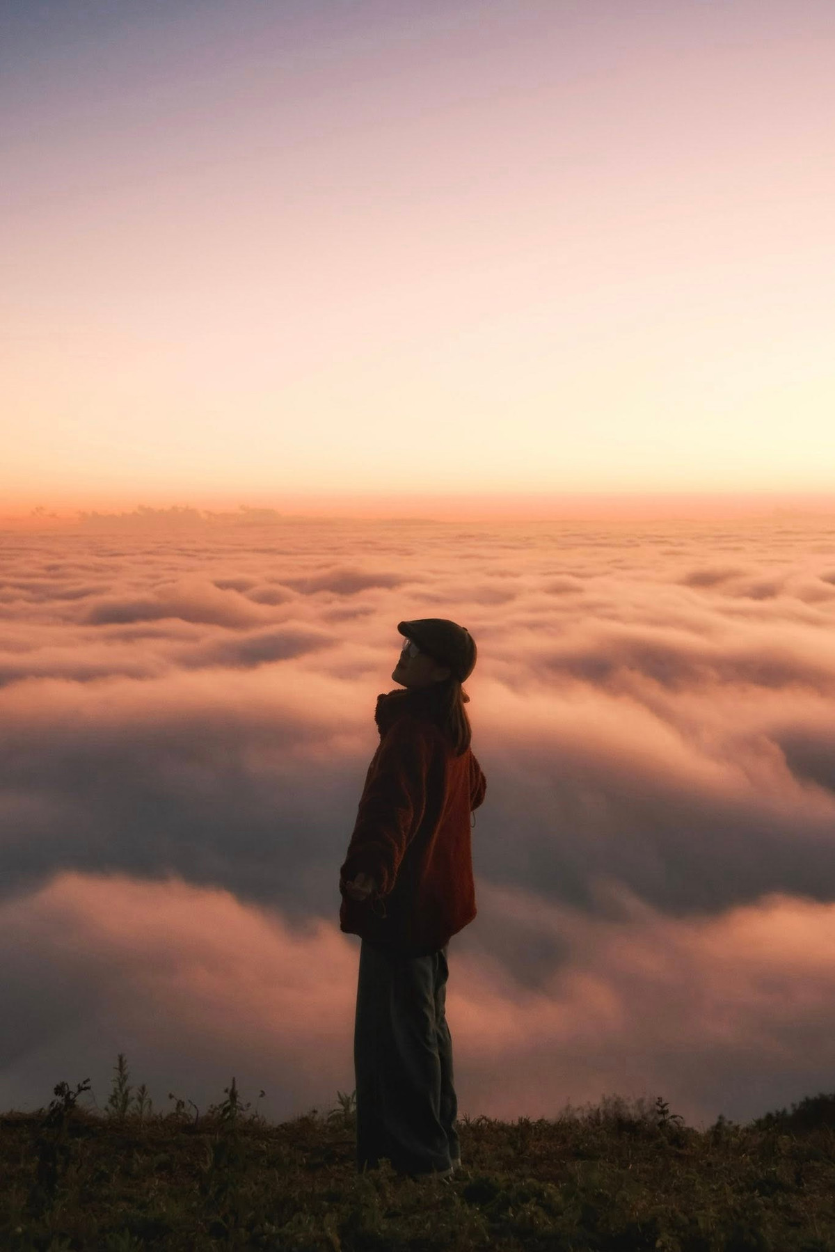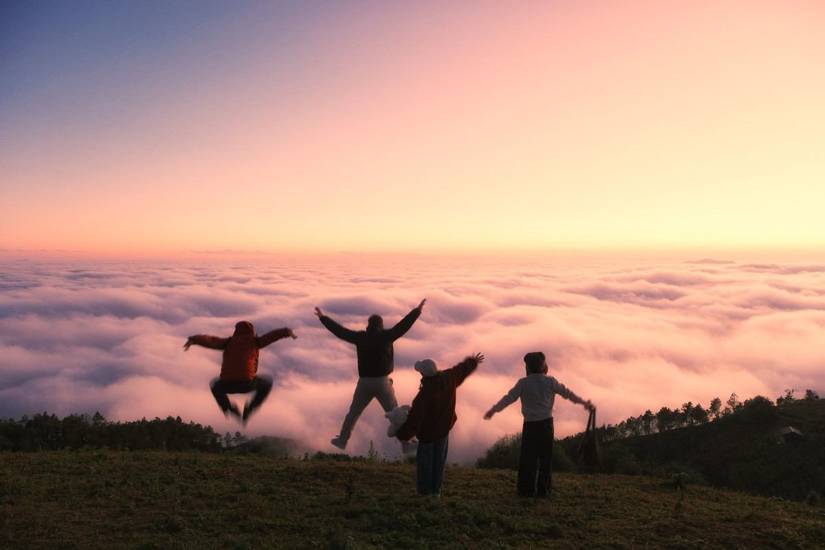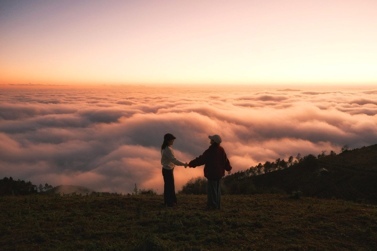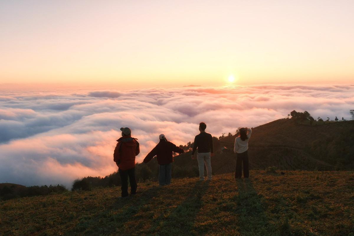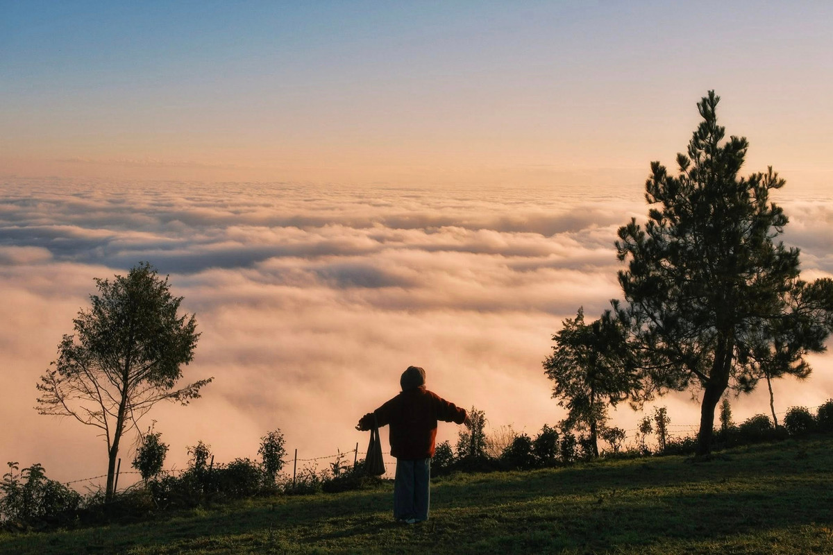 Mặt trời buổi chiều hắt những tia sáng cuối cùng lên biển mây, tạo thành lớp màu huyền ảo như tranh vẽ.