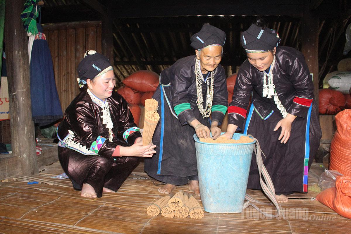 Trong gian nhà sàn ấm áp, các thế hệ phụ nữ Nùng ở Thàng Tín cùng nhau bó hương đã se khô,
