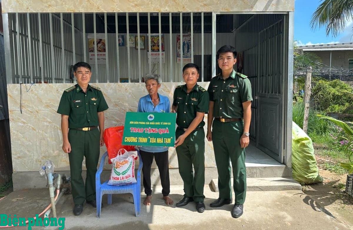 Thiếu tá Nguyễn Văn Sáu (thứ 2, từ phải sang) tặng quà cho hộ gia đình có hoàn cảnh khó khăn trên địa bàn. Ảnh: CTV