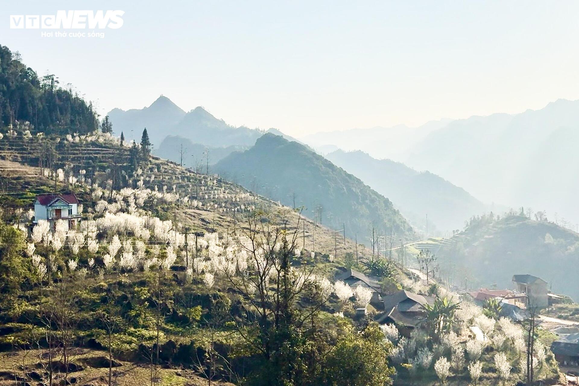 Từ xa nhìn lại, những sườn núi như được phủ lớp trắng tinh khôi, xen lẫn giữa những nếp nhà và ruộng bậc thang.