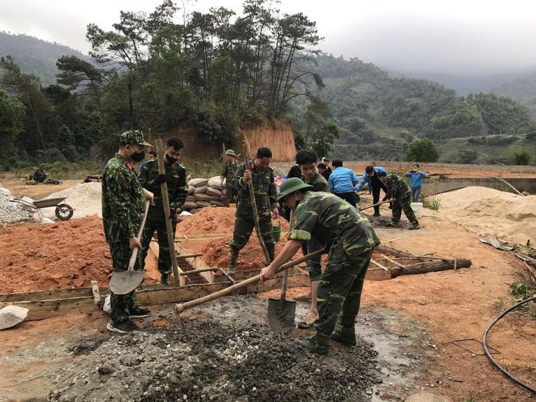 Cán bộ nhân viên Đoàn Kinh tế-Quốc phòng 313 giúp các hộ gia đình khó khăn xây dựng nhà ở trên vùng đất mới.