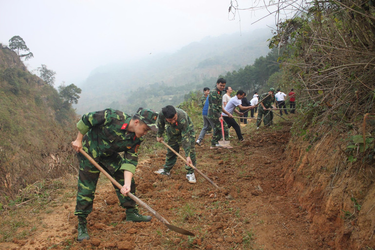 Cán bộ nhân viên Đoàn Kinh tế-Quốc phòng 313 tham gia mở đường giao thông nông thôn.